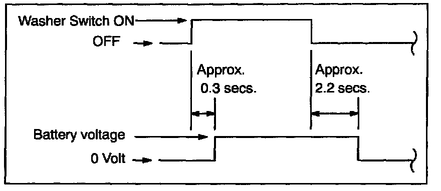 Connect the positive (+) lead from the battery to terminal 1, and the negative (-) lead to terminal 2 and the motor body, check that the motor operates intermittently for 9 - 15 seconds. If operation is not as specified, replace the motor and relay.