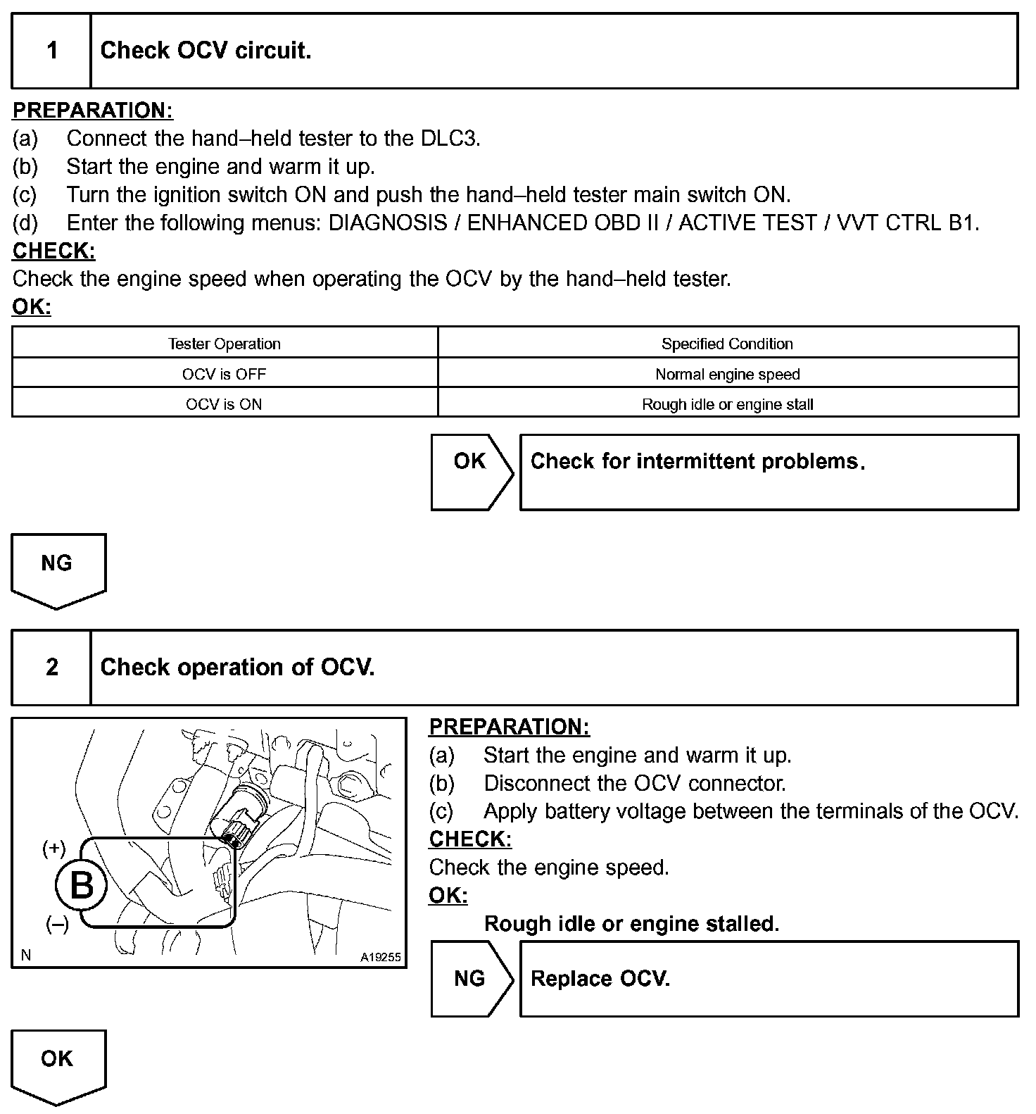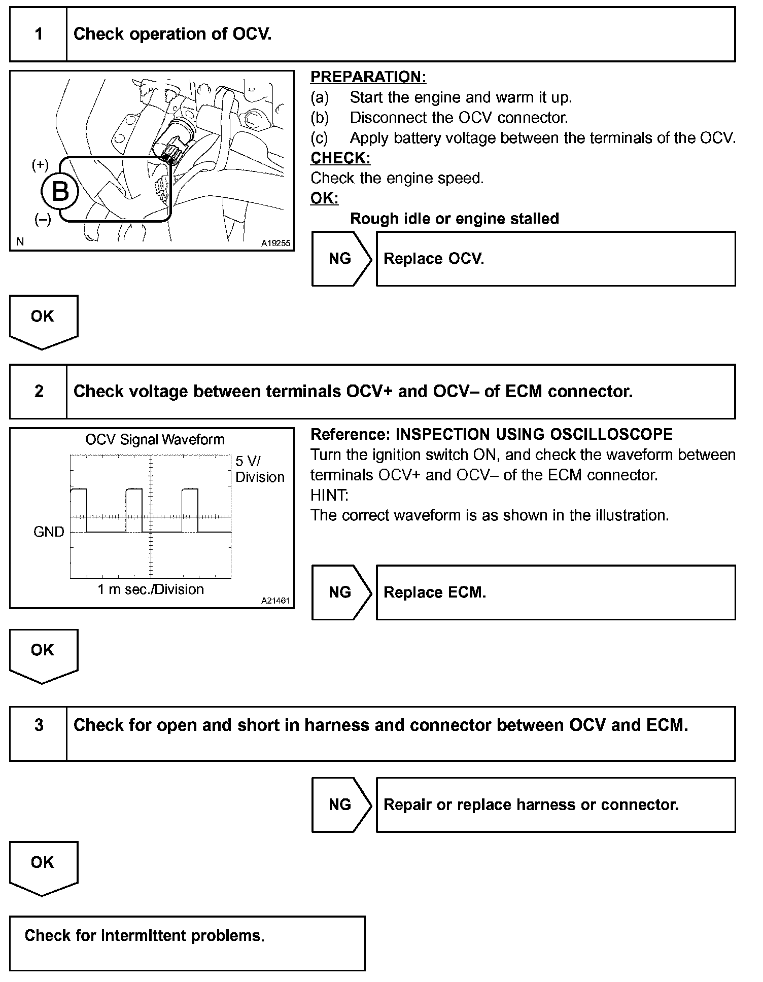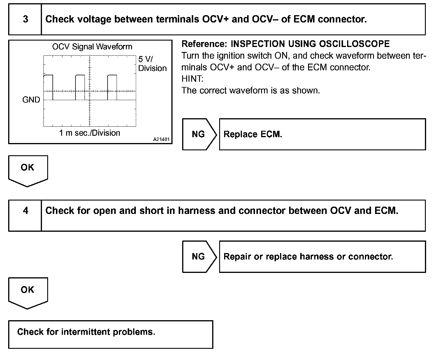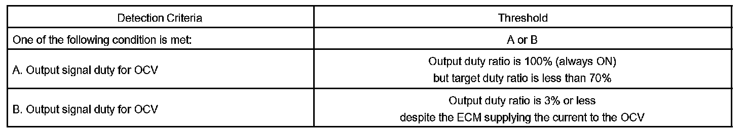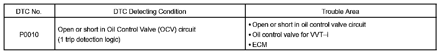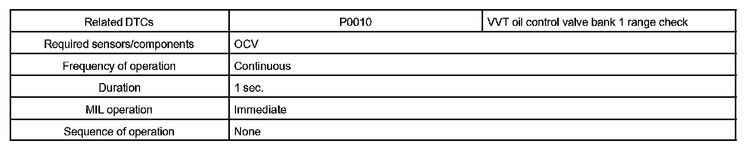 After the ECM sends the "target" duty-cycle signal to the OCV (Oil Control Valve), the ECM monitors the OCV current to establish an "actual" duty-cycle. When the actual duty-cycle ratio varies from the target duty-ratio, the ECM sets a DTC.