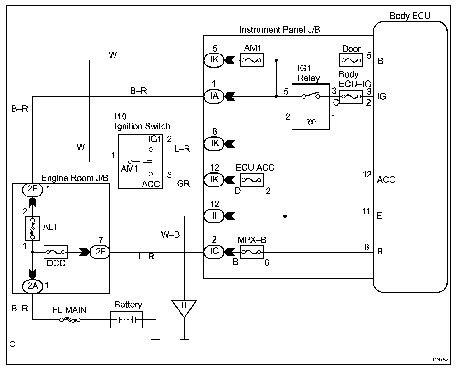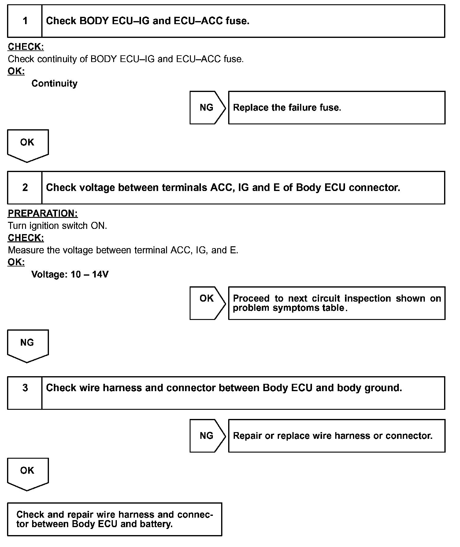 When the ignition switch is turned to the ACC position, battery voltage is applied to terminal ACC of ECU, and when the ignition switch is turned to the ON position, battery voltage is applied to terminal IG of ECU.