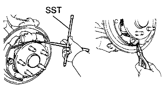 a. Using SST, disconnect the adjuster spring from the rear shoe.