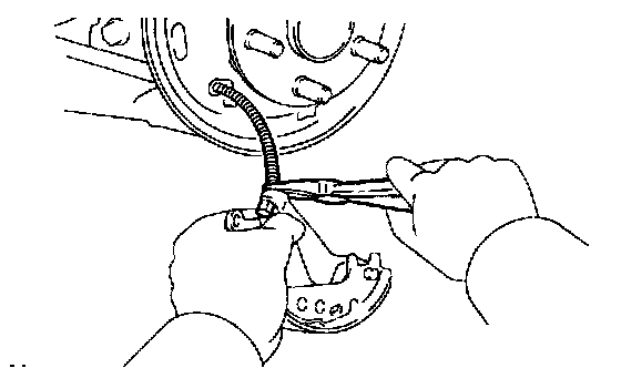 b. Using needle-nose pliers, disconnect the parking brake cable from the parking brake lever, and remove the rear shoe.