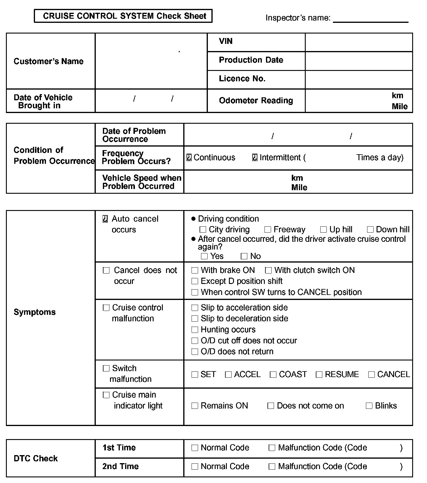 Cruise Control System Check Sheet: