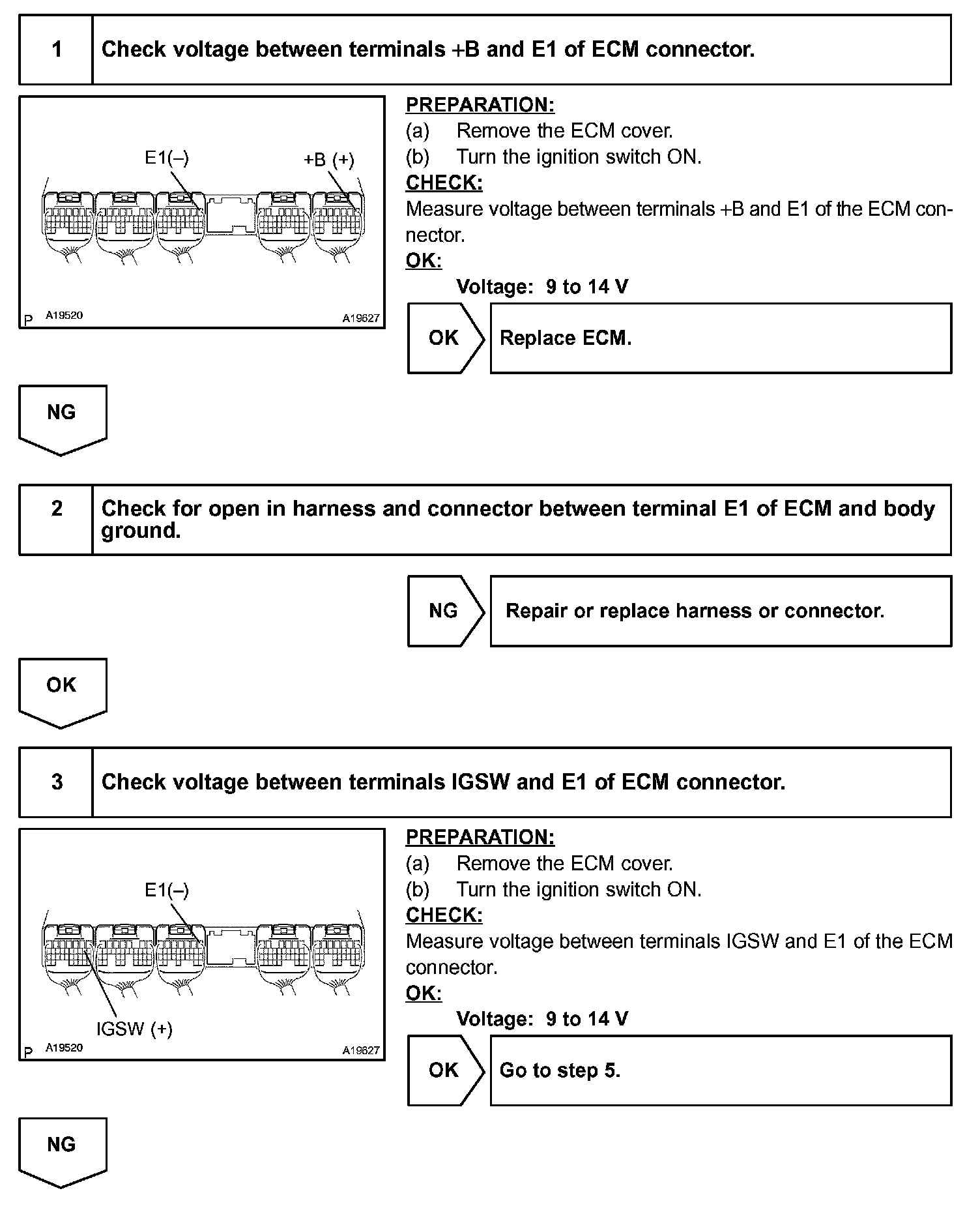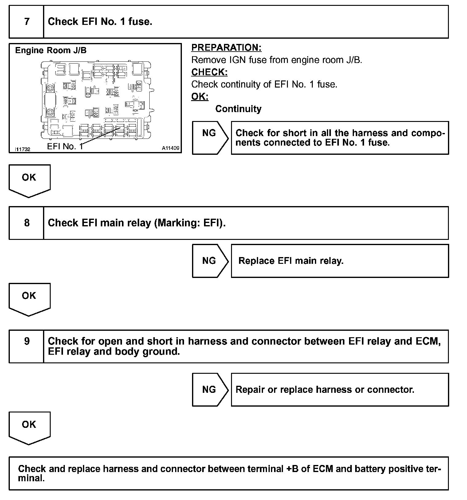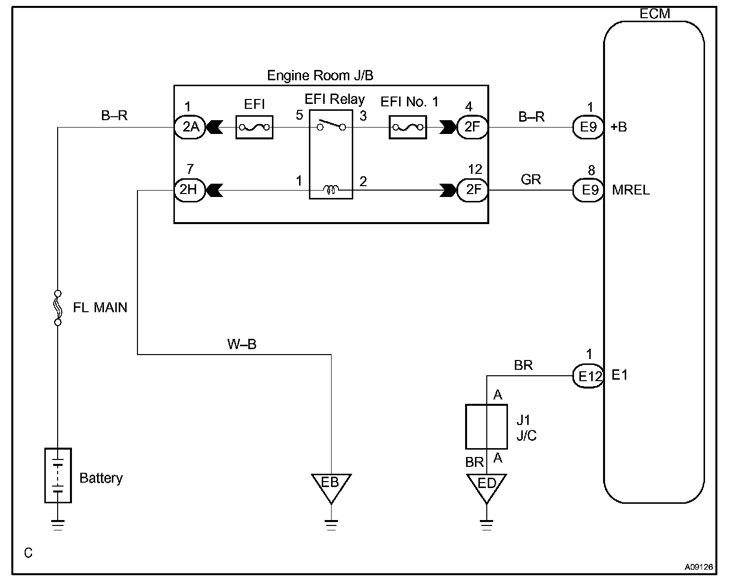 CIRCUIT DESCRIPTIONWhen the ignition switch is turned ON, battery voltage is applied to terminal IGSW of the ECM. The ECM "MREL" output signal causes current to flow to the coil, closing the contacts of the EFI relay and supplying power to terminal +B of the ECM.