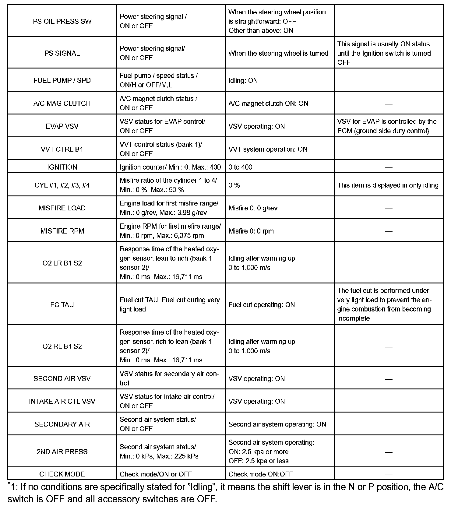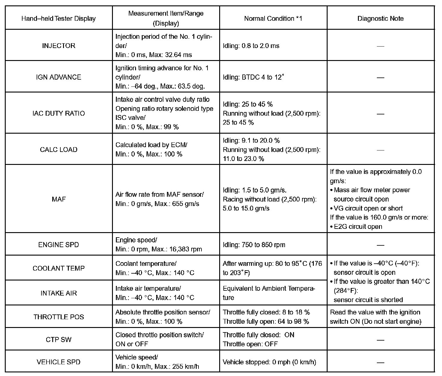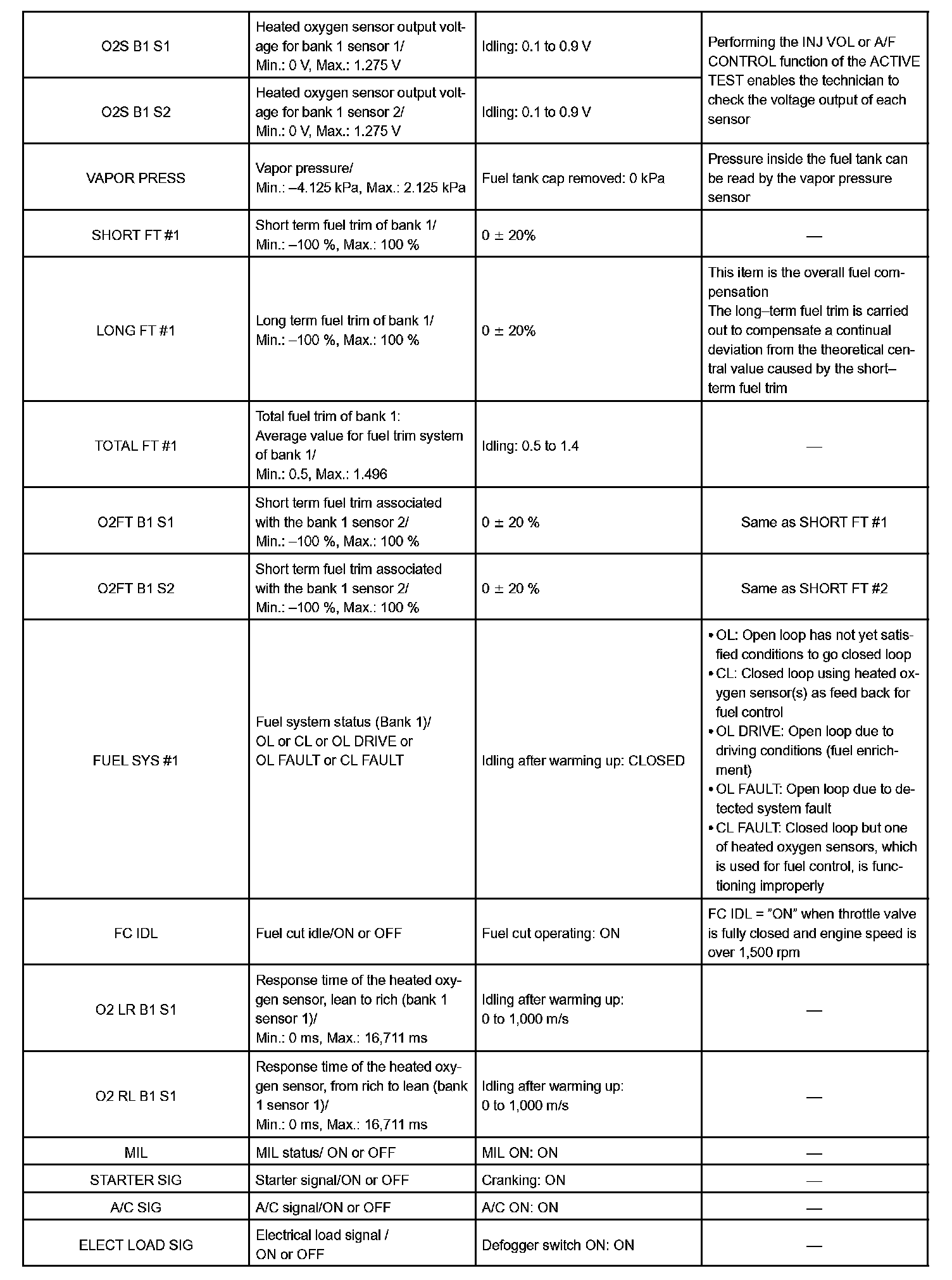 DATA LISTHINT: Using the hand-held tester DATA LIST allows switch, sensor, actuator and other item values to be read without removing any parts. Reading the DATA LIST early in troubleshooting is one way to shorten labor time.