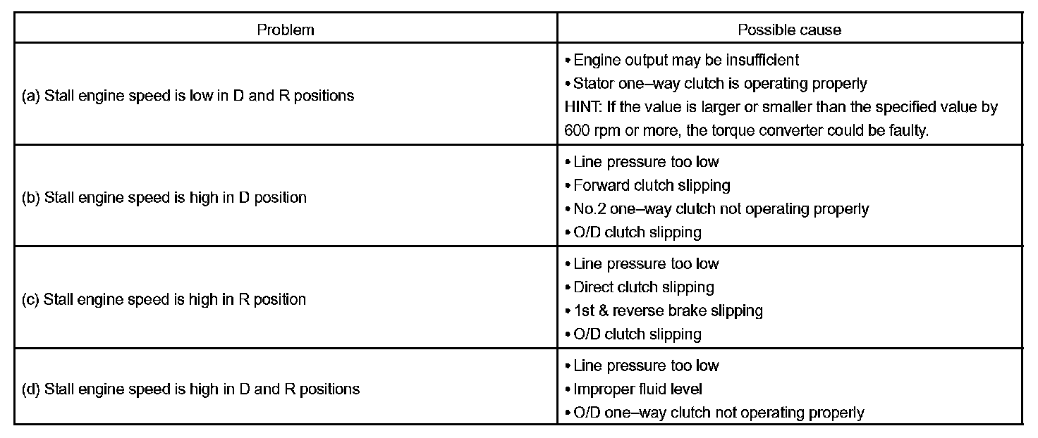 The object of this test is to check the overall performance of the transaxle and engine by measuring the stall speeds in the D and R positions.