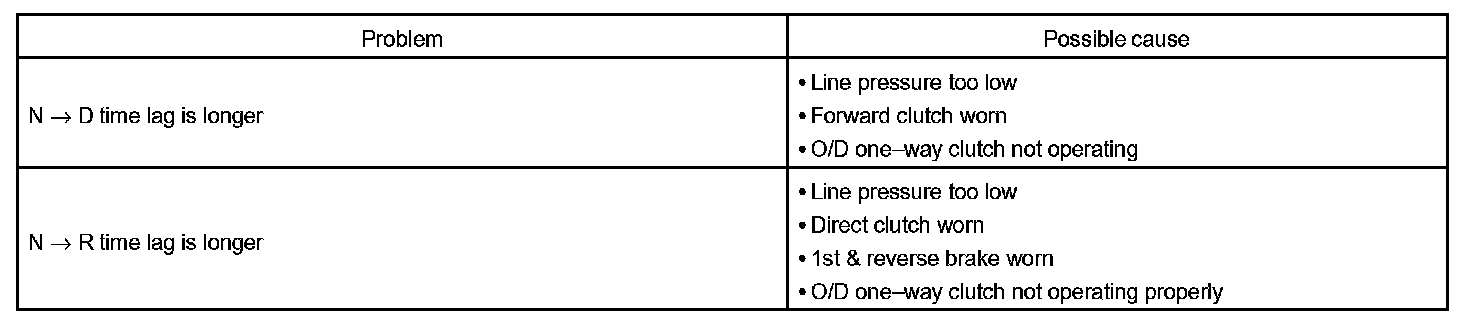 When the shift lever is shifted while the engine is idling, there will be a certain time lapse or lag before the shock can be felt. This is used for checking the condition of the O/D direct clutch, forward clutch, and 1st & reverse brake.