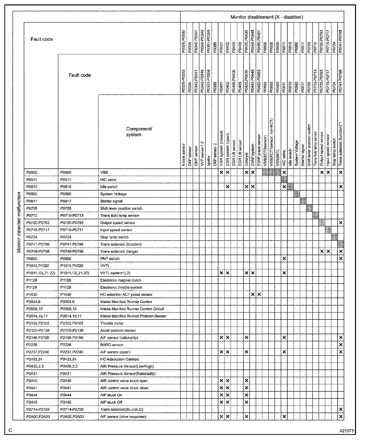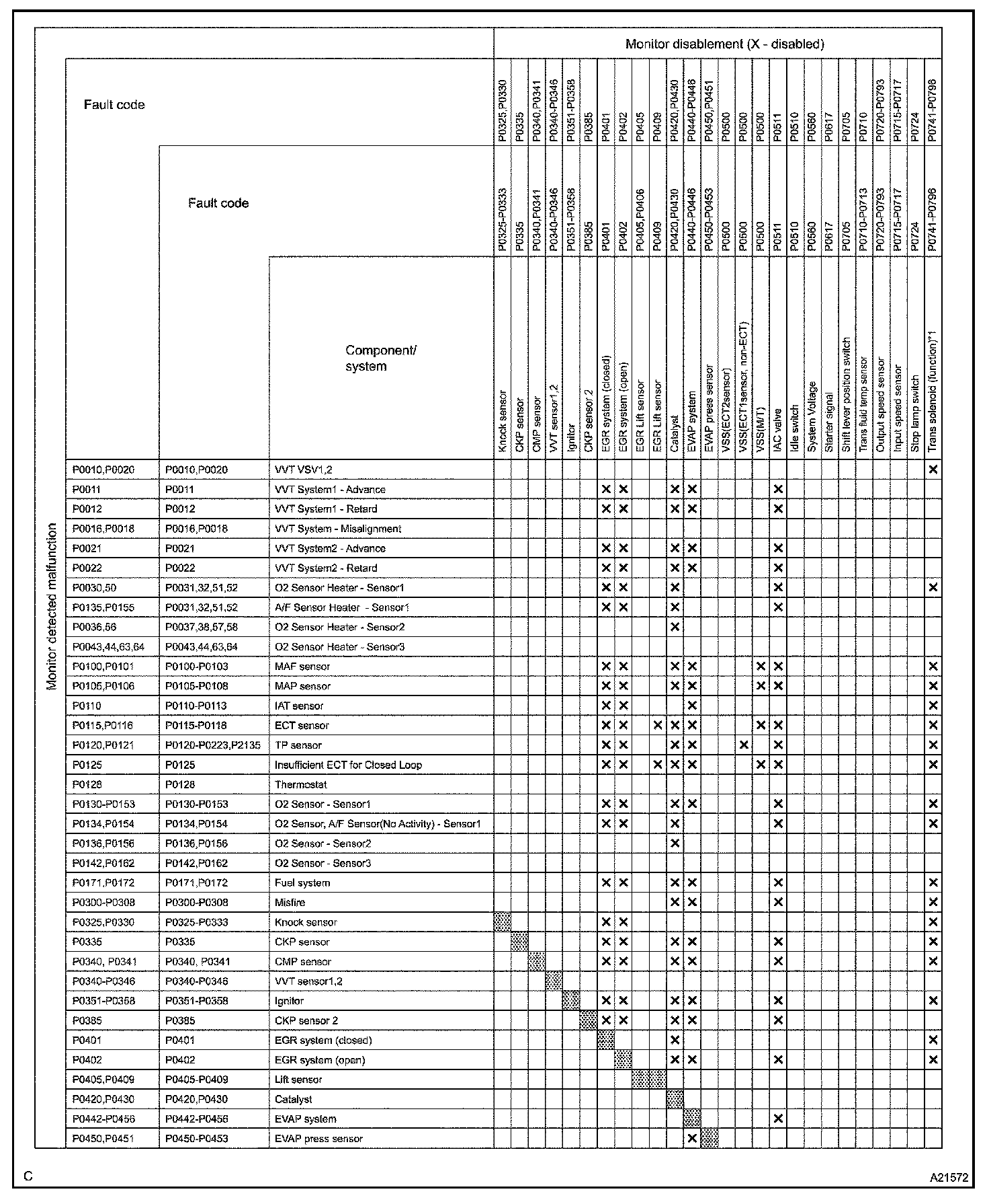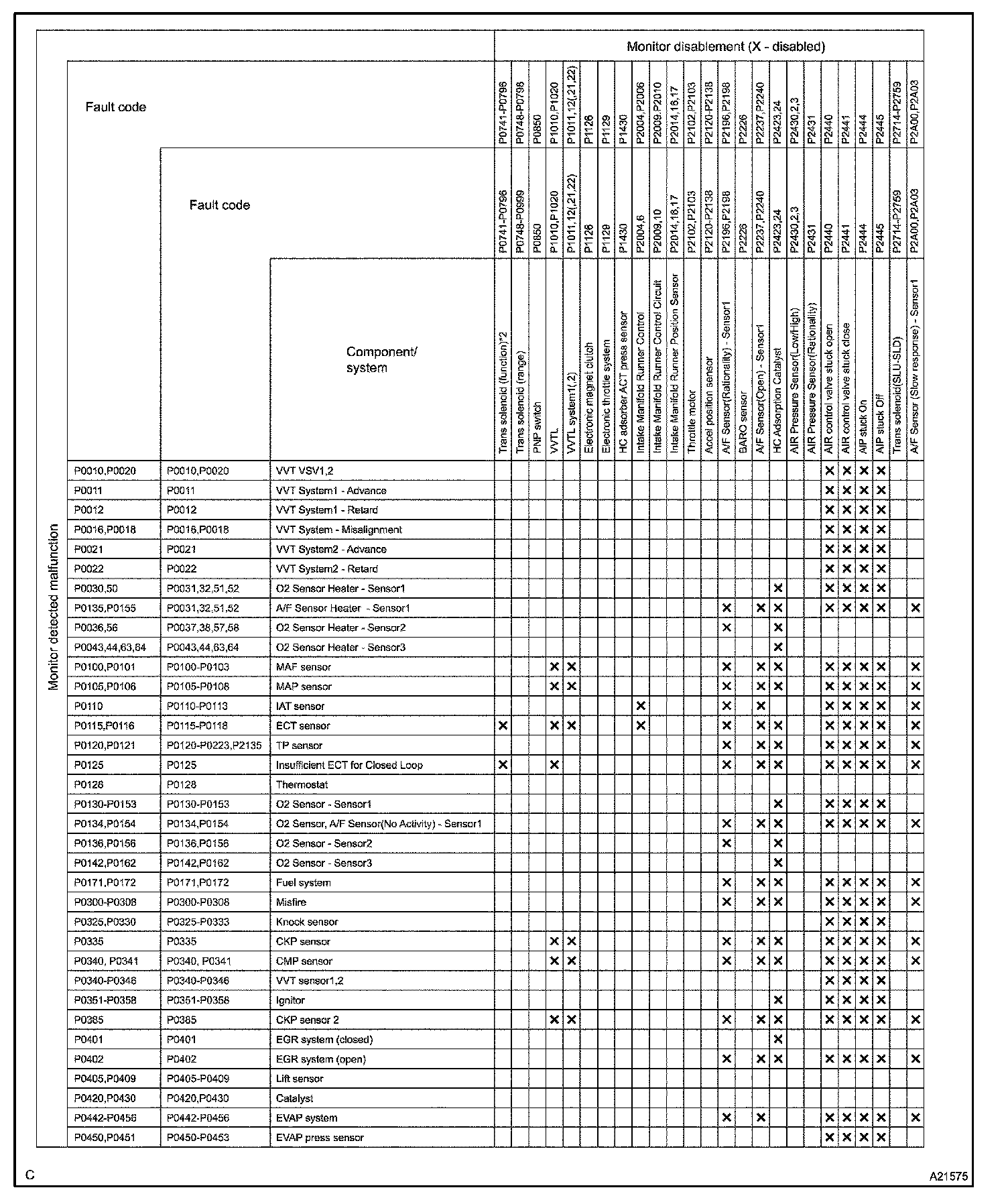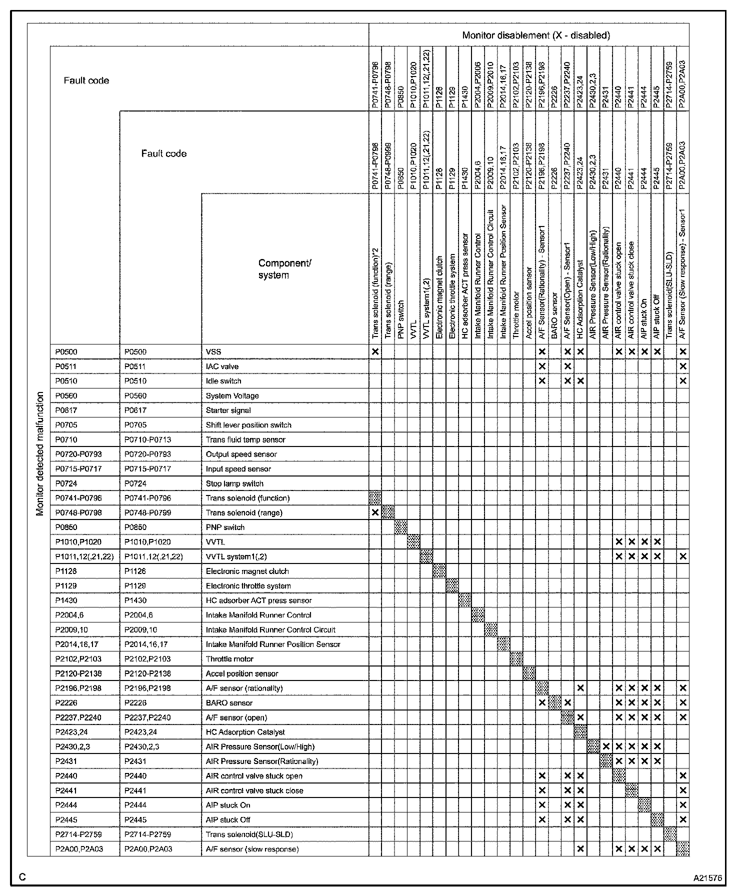 THE MONITOR WILL RUN WHENEVER THE FOLLOWING DTCS ARE NOT PRESENT (MONITOR DISABLEMENT LIST)HINT: This table indicates ECM monitoring status for the items in the upper columns if the DTCs in each line on the left are being set.