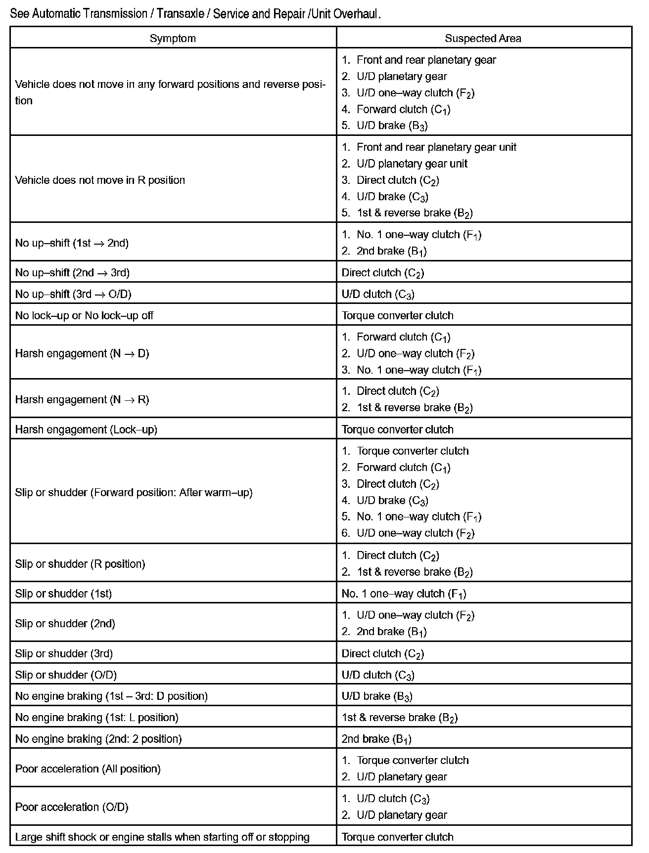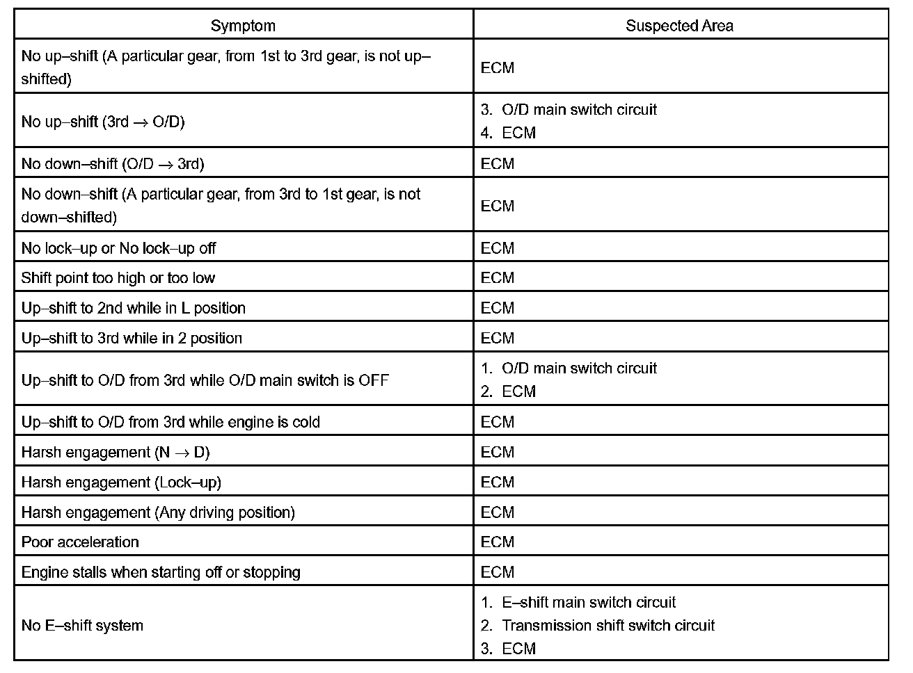 PROBLEM SYMPTOMS TABLEIf a normal code is displayed during the diagnostic trouble code check but the trouble still occurs, check the circuits for each symptom in the order given in the charts and proceed to troubleshooting.