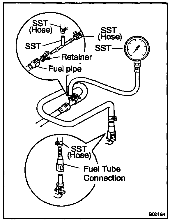 p. After checking fuel pressure, disconnect the negative (-) terminal cable from the battery and carefully, remove the SST and fuel tube connector to prevent gasoline from splashing.