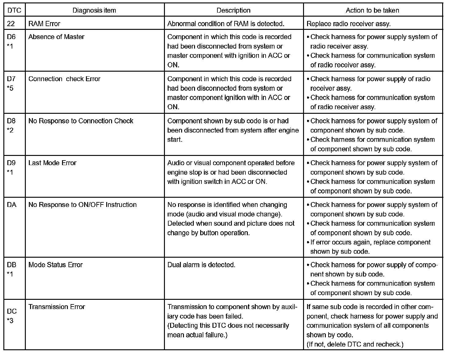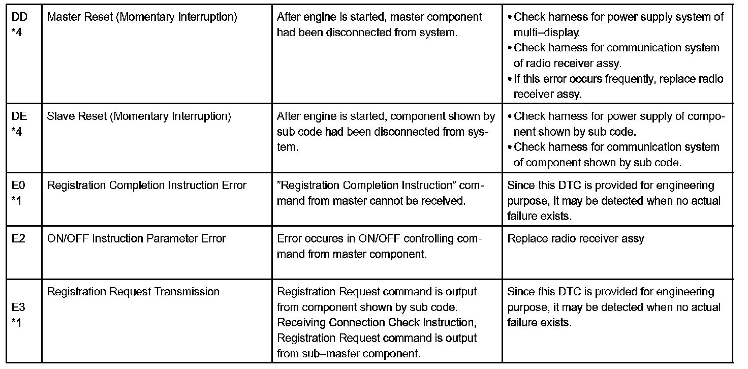 - *5: When 210 sec. has passed after pulling out the power supply connector of the master component with the ignition switch in ACC or ON, this code is stored.
