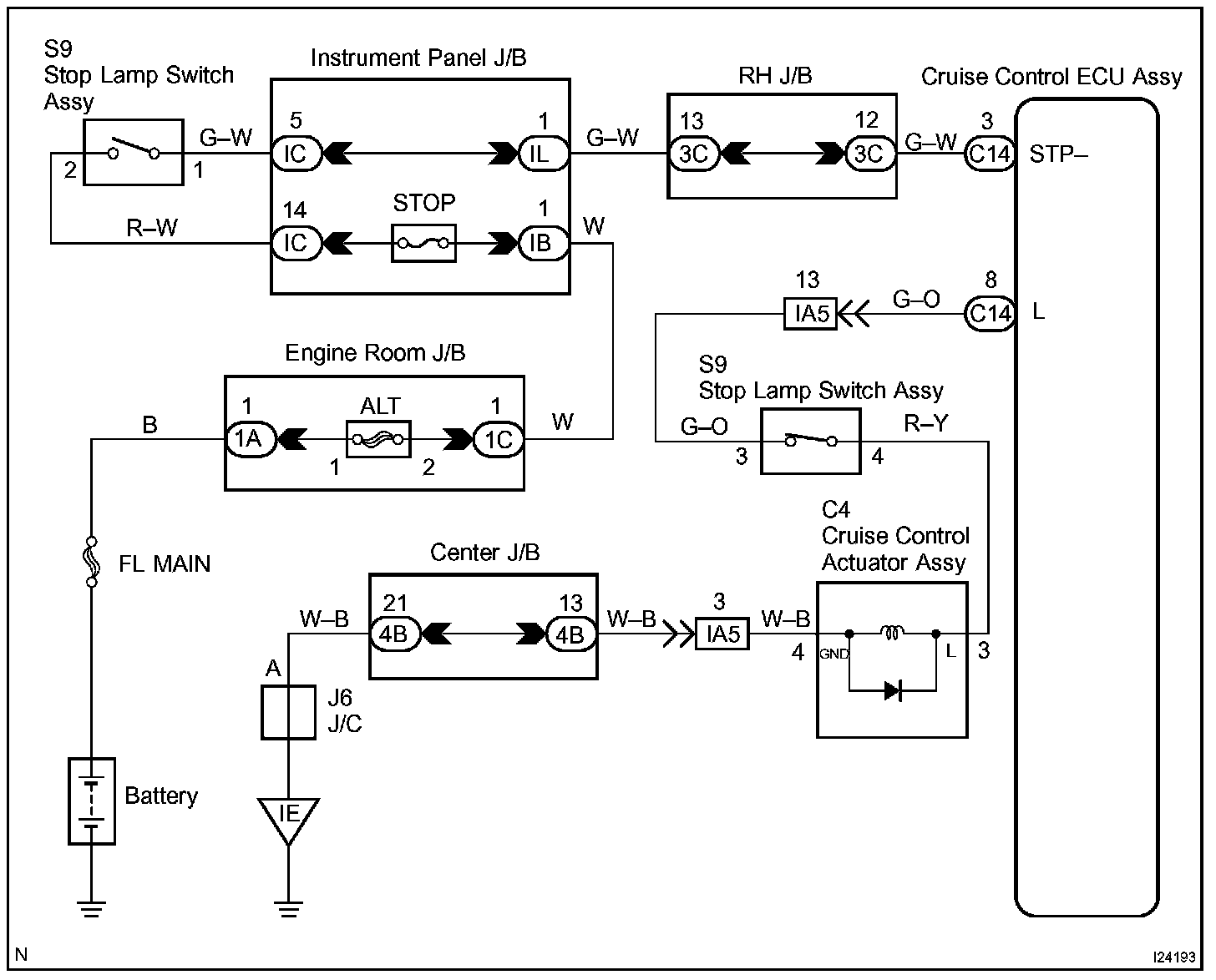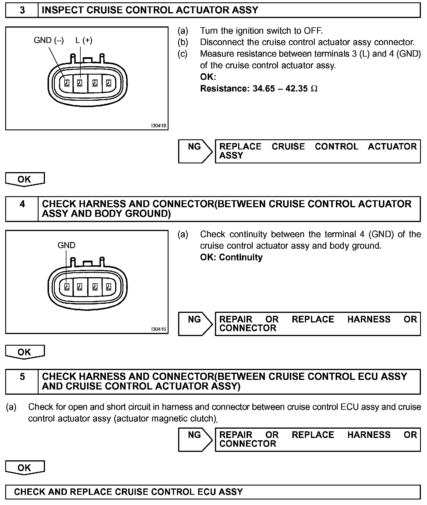 When the brake pedal is depressed, the stop lamp switch assy turns ON, supplying electrical power to the stop light. Power supply to the magnetic clutch is mechanically cut and the magnetic clutch is turned OFF. When driving downhill, if the vehicle speed exceeds the set speed by 8 km/h (5 mph), the ECU turns the safety magnet clutch OFF. If the vehicle speed later drops to within 5 km/h (3 mph) above the set speed, then cruise control at the set speed is resumed.