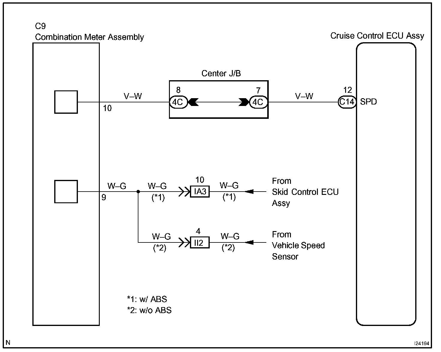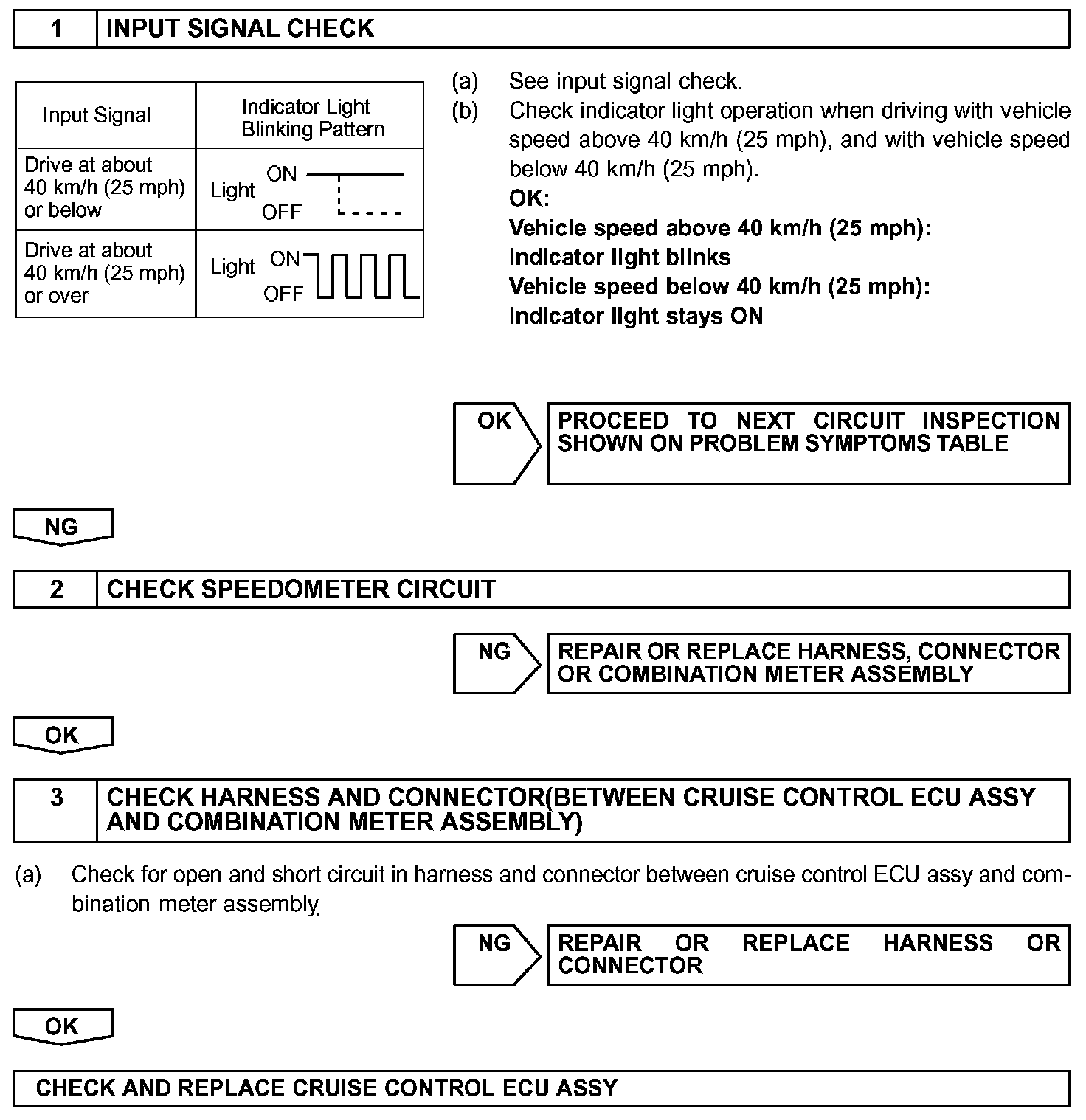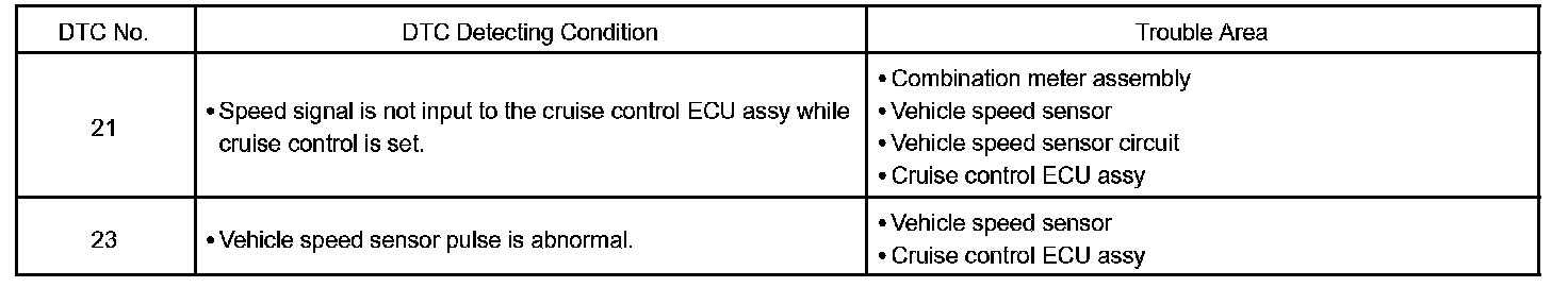 The vehicle speed sensor circuit is sent to cruise control ECU assy as a vehicle speed signal. For each rotation of the shaft, the vehicle speed sensor sends a signal through the combination meter assembly to the cruise control ECU assy (See the chart). The cruise control ECU assy calculates the vehicle speed from this pulse frequency.