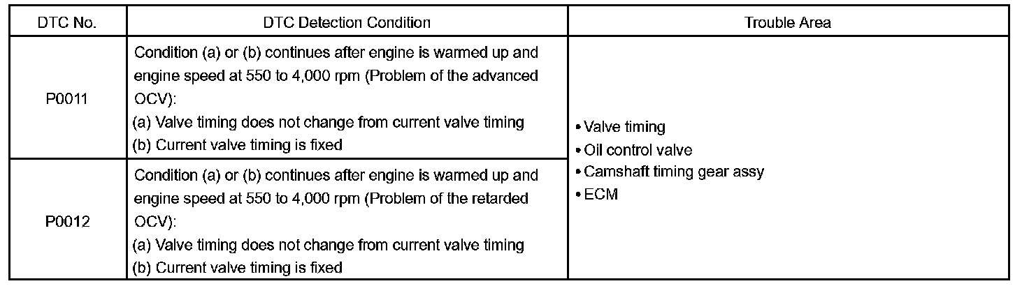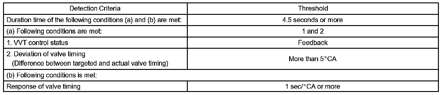 When a difference between the targeted and actual valve timing is more than 5° camshaft angle "CA" and this condition continues for more than 4.5 sec, and if the OCV is forcibly activated 63 times or more.