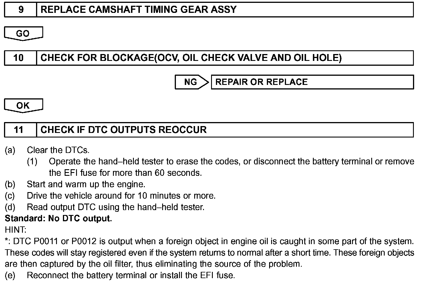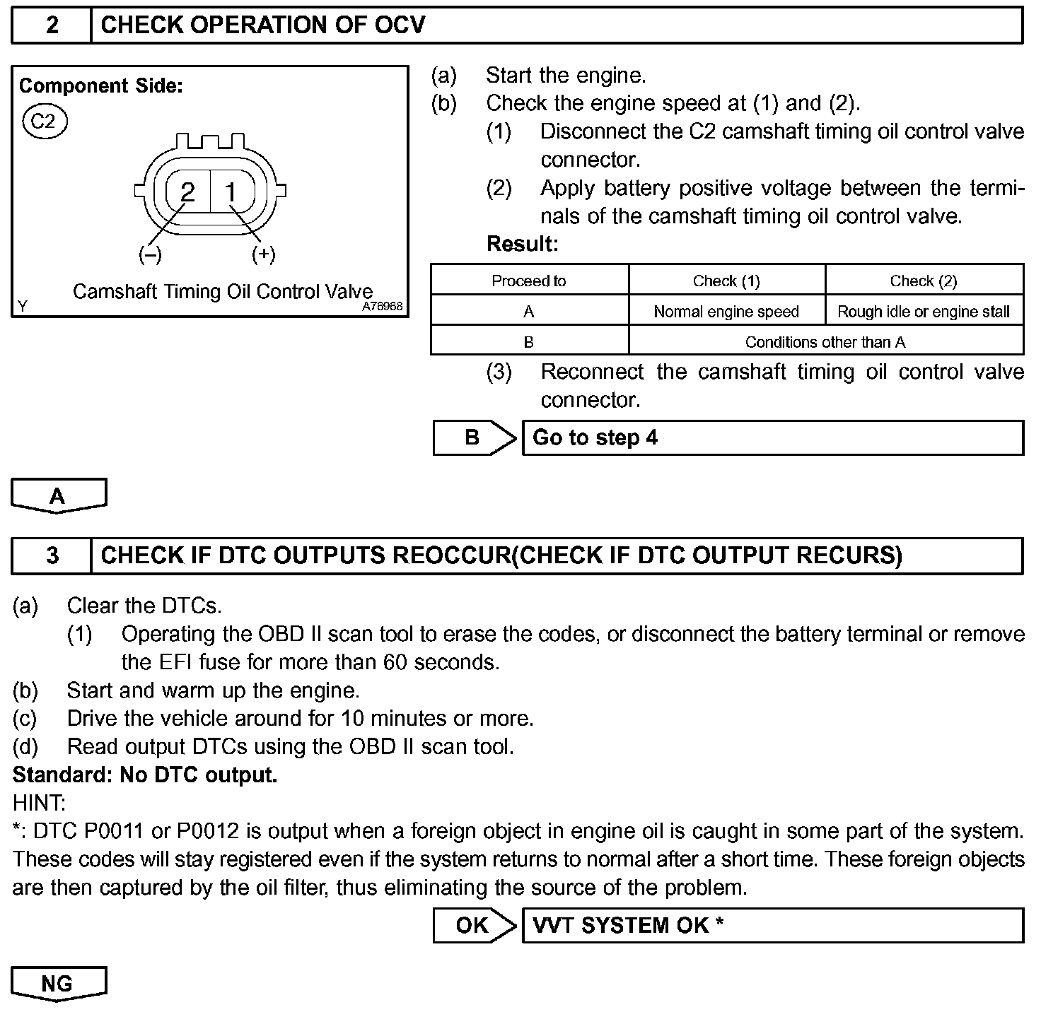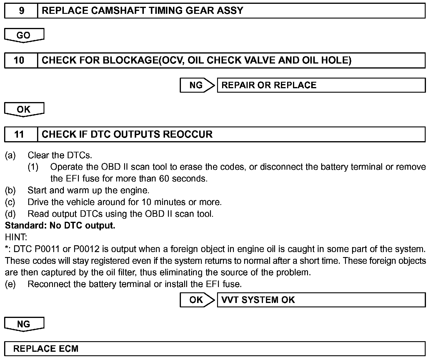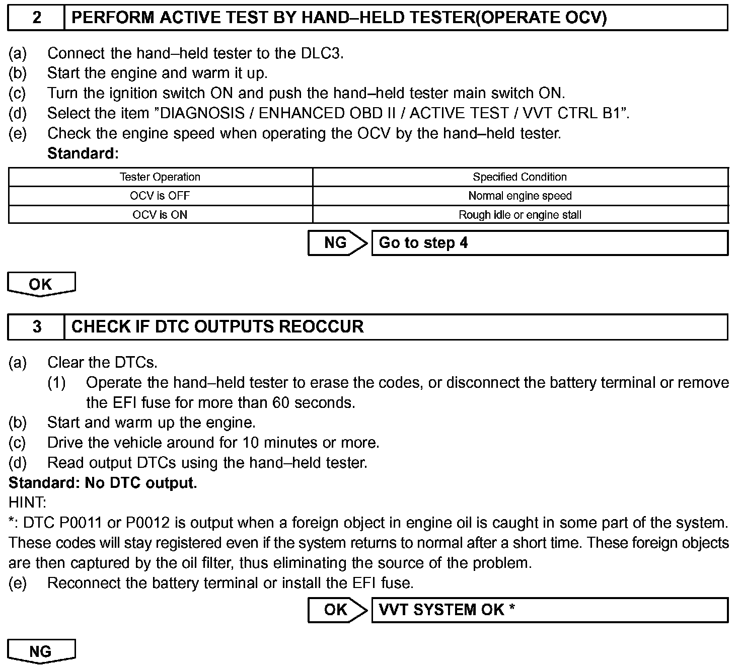 - If DTC P0011 or P0012 is displayed, check the VVT system circuit.