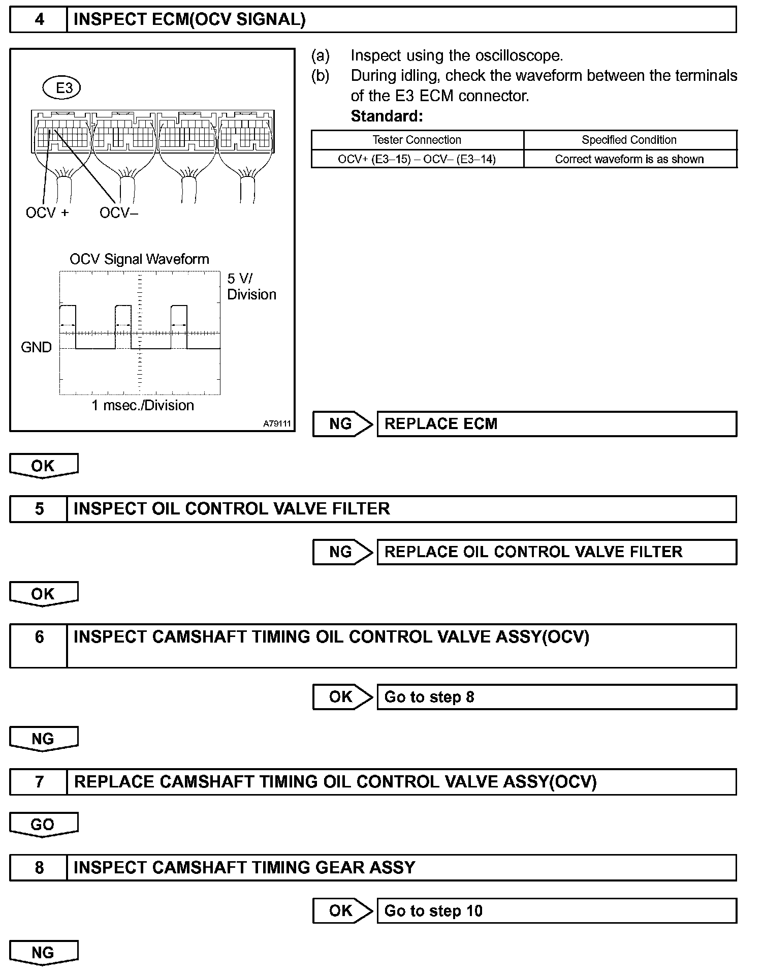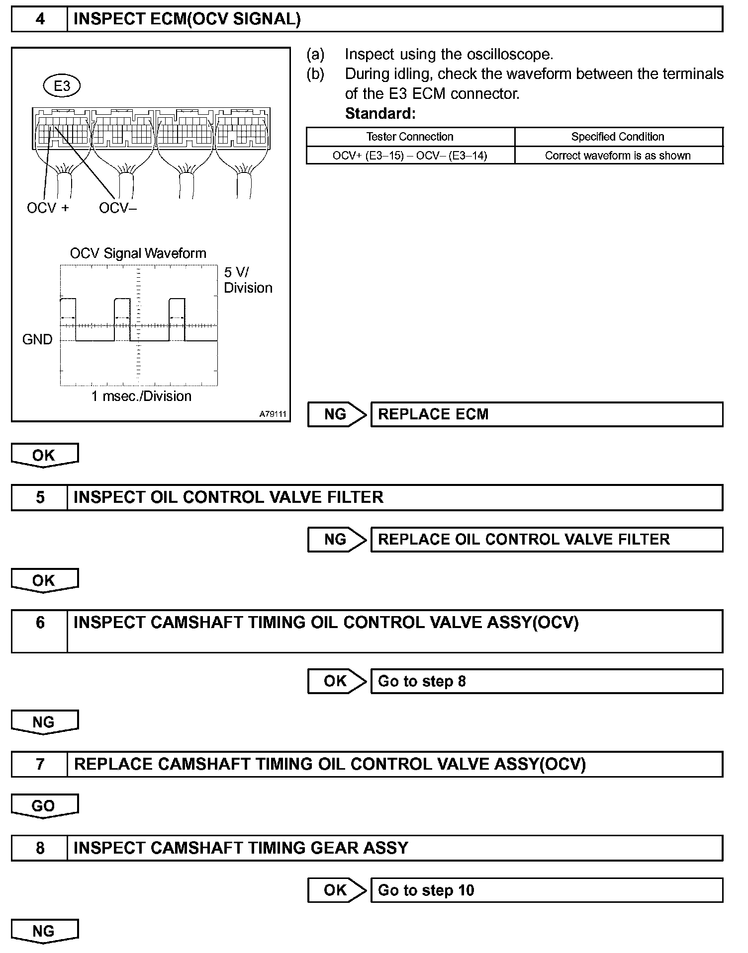 The ECM controls the OCV, based on the signals output from the sensors. The VVT controller regulates the intake camshaft angle using oil pressure through the OCV. As result, the relative position between the camshaft and the crankshaft is optimized, and the engine torque improves, fuel economy improves, and exhaust emissions decrease under overall driving conditions. Also, the ECM detects the actual valve timing using signals from the camshaft position sensor and the crankshaft position sensor, and performs the feedback control. This is how target valve timing is verified by the ECM.