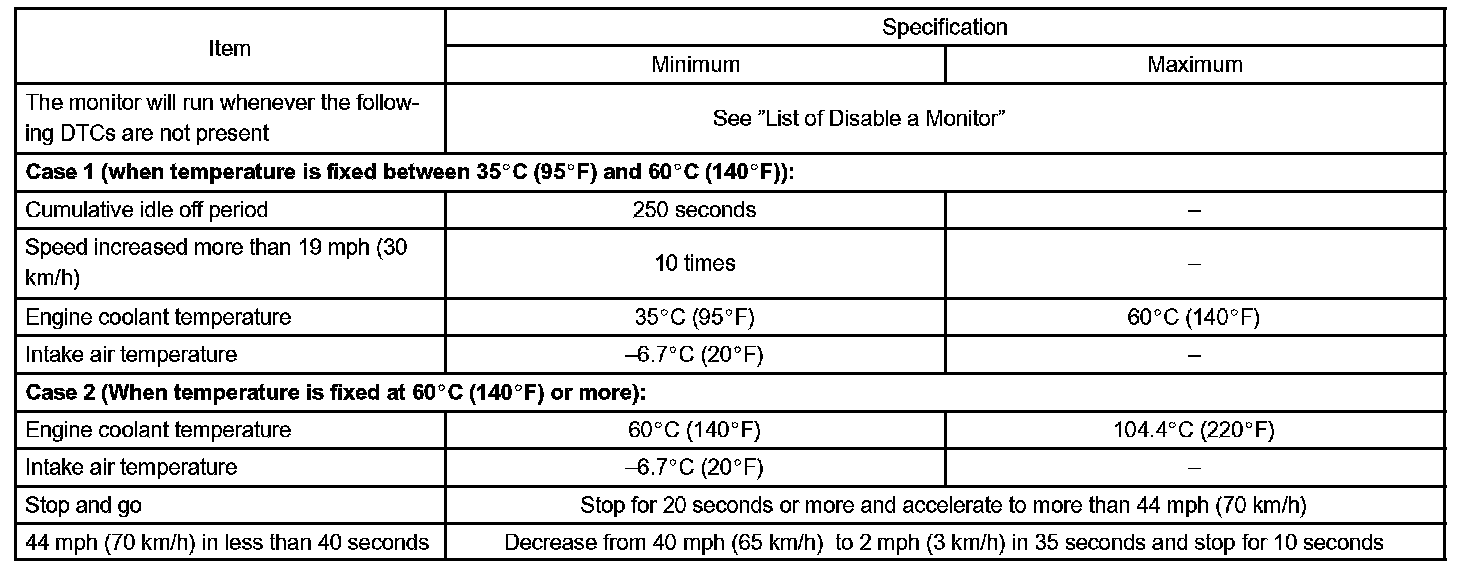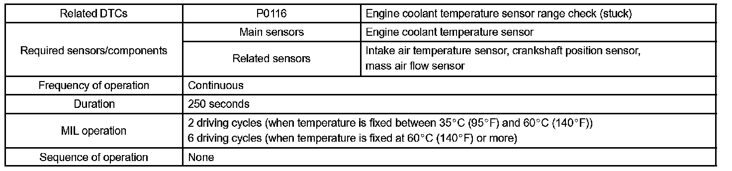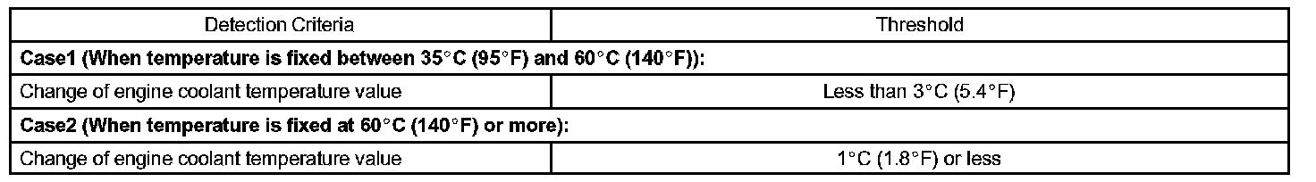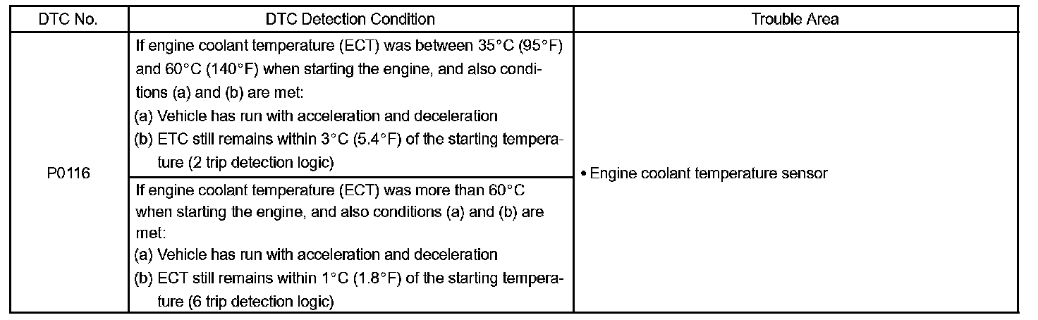 1. Upon starting the engine, the coolant temperature (ECT) was between 35 °C (95 °F) and 60 °C (140 °F). If after driving for 250 seconds, the ECT still remains within 3 °C (5.4 °F) of the staring temperature, a DTC will be set. (2 trip detection logic)