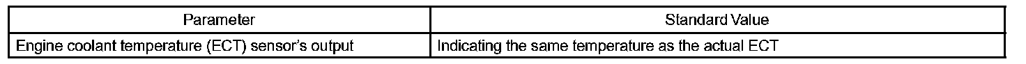 The engine coolant temperature (ECT) sensor is used to monitor the engine coolant temperature. The ECT sensor has a thermistor that varies its resistance depending on the temperature of the engine coolant. When the coolant temperature is low, the resistance in the thermistor increases. When the temperature is high, the resistance drops. The variations in resistance are reflected in the voltage output from the sensor. The ECM monitors the sensor voltage and uses this value to calculate the engine coolant temperature. When the sensor output voltage deviates from the normal operating range, the ECM interprets this as a fault in the ECT sensor and sets a DTC.