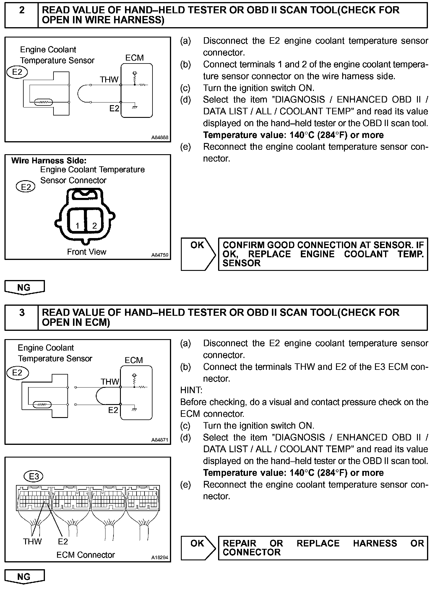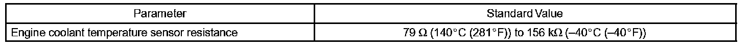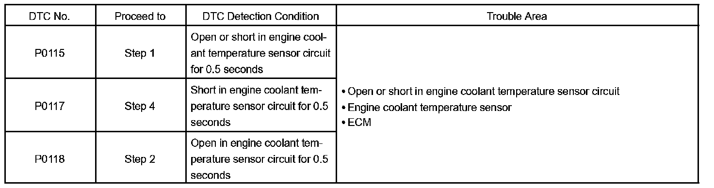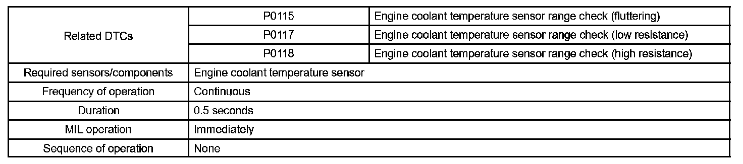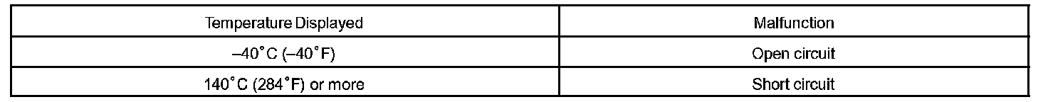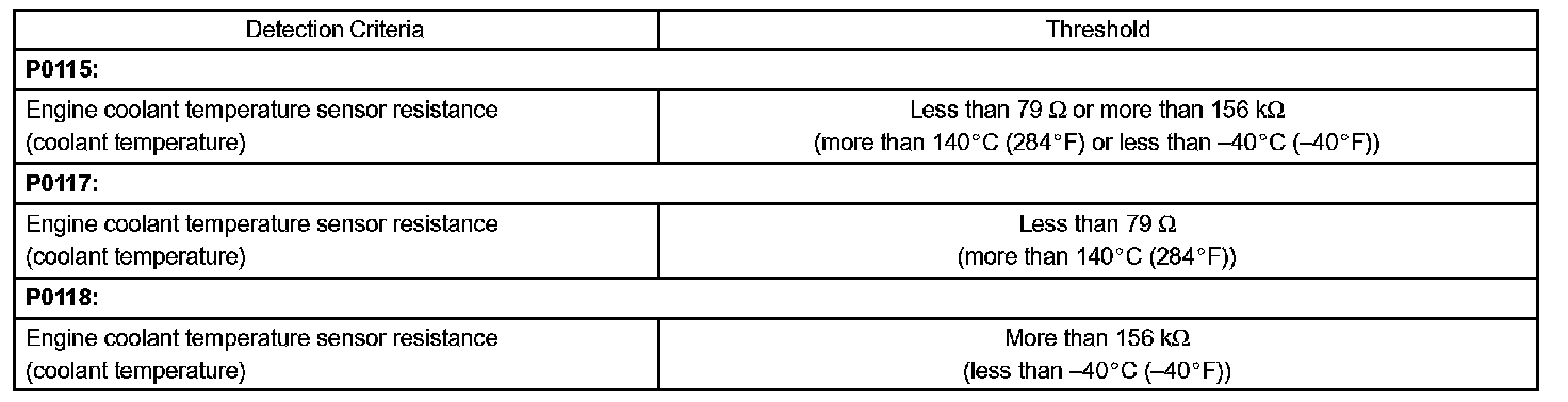 When the ECM calculates that the ECT is -40 °C (-40 °F), or more than 140 °C (284 °F), and if either the condition continues for 0.5 sec or more, the ECM will set a DTC.