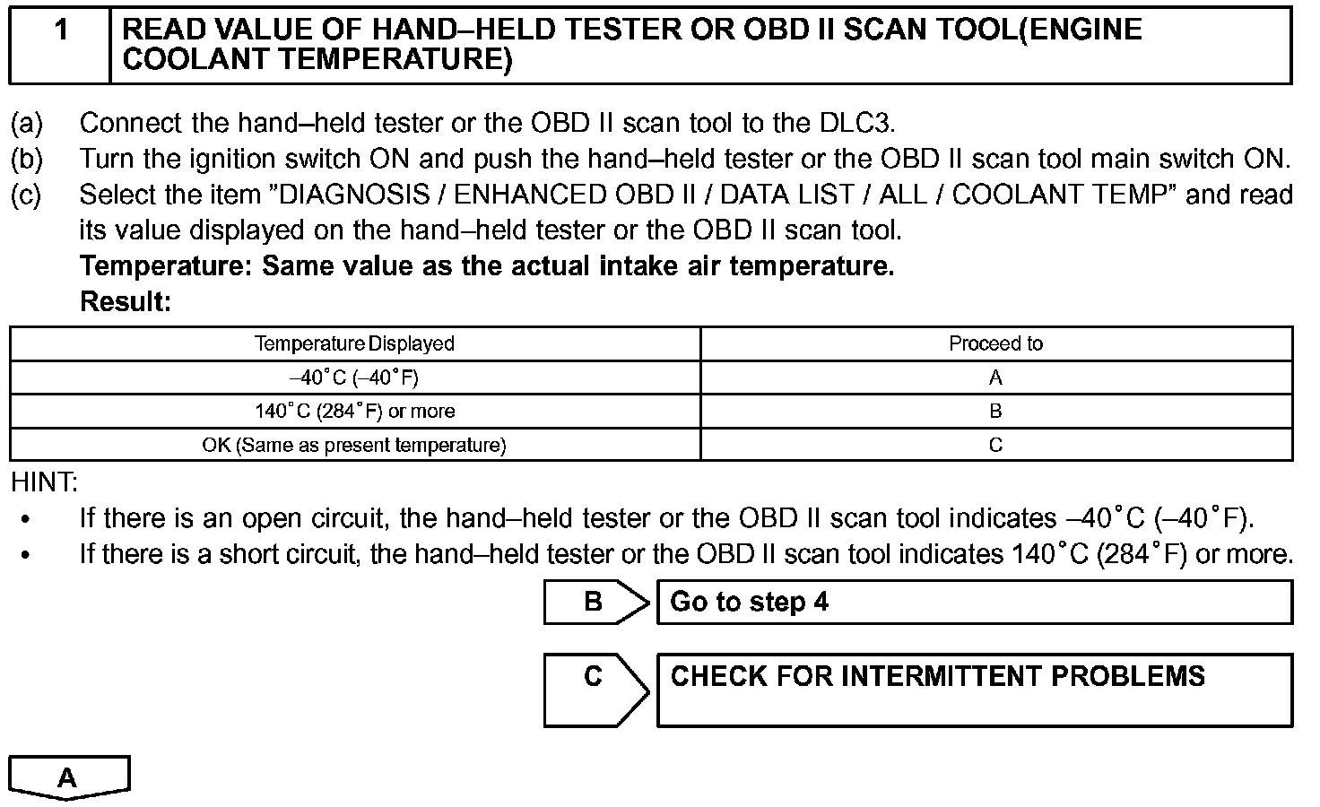 - After confirming DTC P0115, P0117 or P0118, confirm the engine coolant temperature in the "DIAGNOSIS/ ENHANCED OBD II/DATA LIST/ALL" using the hand-held tester or the OBD II scan tool.