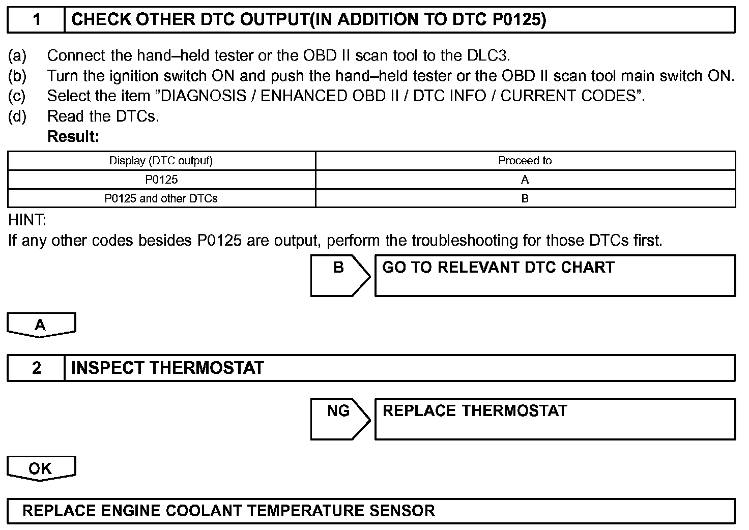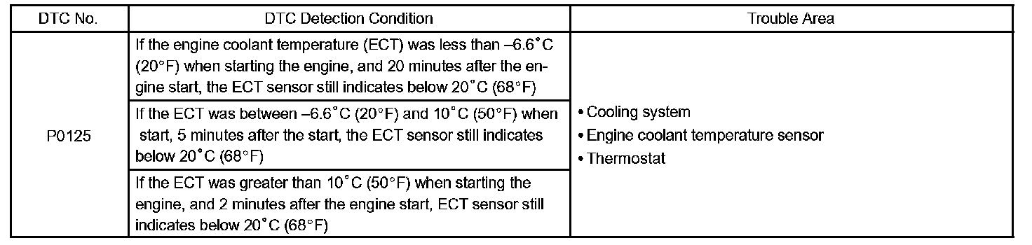 - If DTCs P0115, P0116, P0117, P0118 and P0125 are output simultaneously, the engine coolant temperature sensor circuit may be open or short. Perform the troubleshooting of DTC P0115, P0117 or P0118 first.