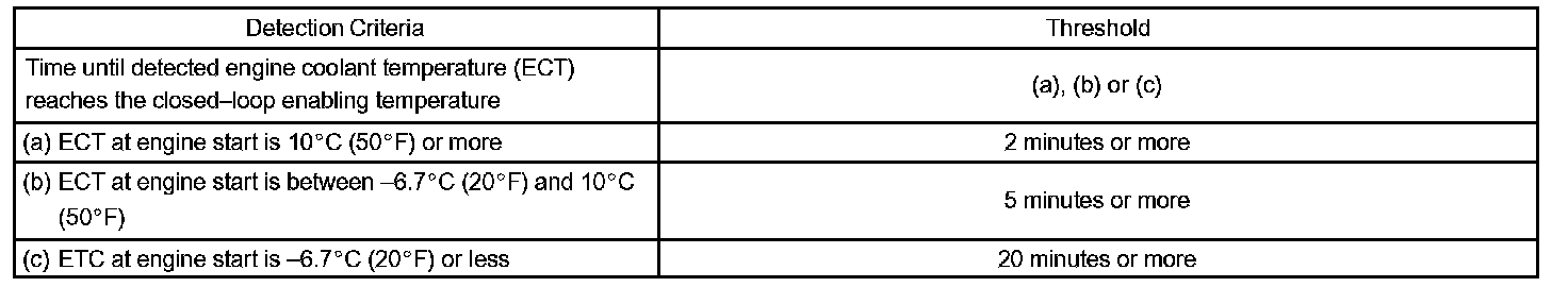 The engine coolant temperature was 0 °C (32 °F) at engine start. After 5 minutes running time, the coolant temperature sensor still indicates that the engine is not warm enough to begin air-fuel ratio feedback control. The ECM interprets this as a fault in the sensor or cooling system and will set a DTC.