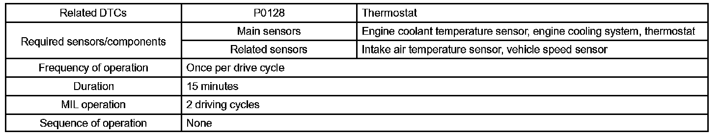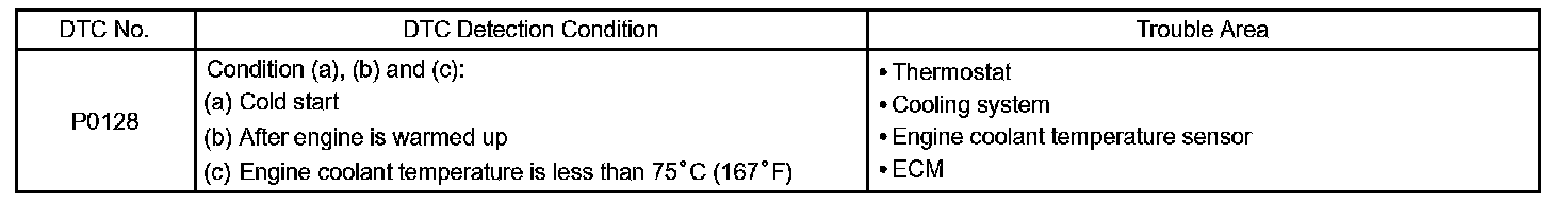 DTC P0128 COOLANT THERMOSTAT (COOLANT TEMPERATURE BELOW THERMOSTAT REGULATING TEMPERATURE)HINT: This is the purpose of the "thermostat" malfunction detection.