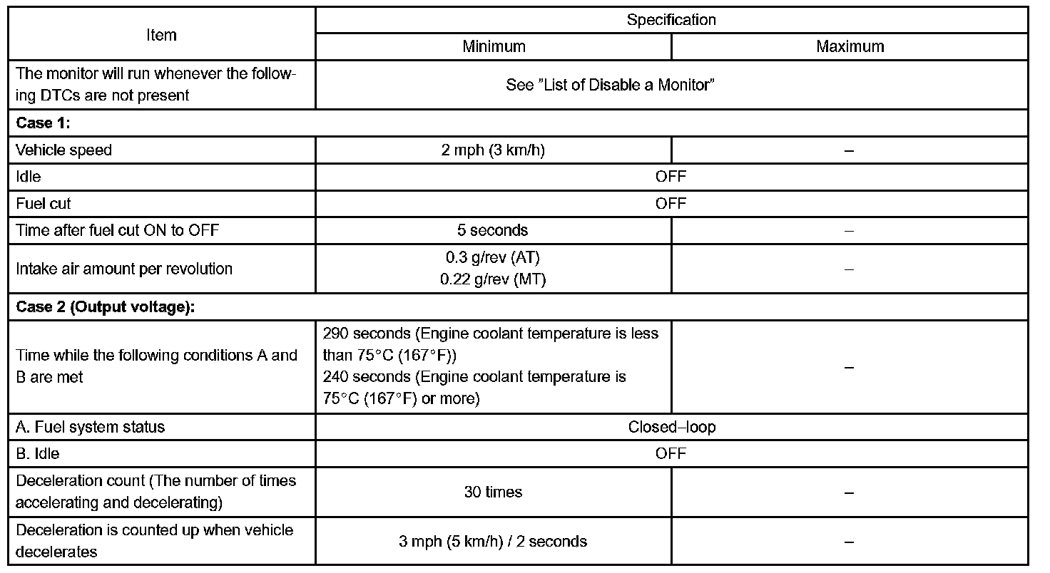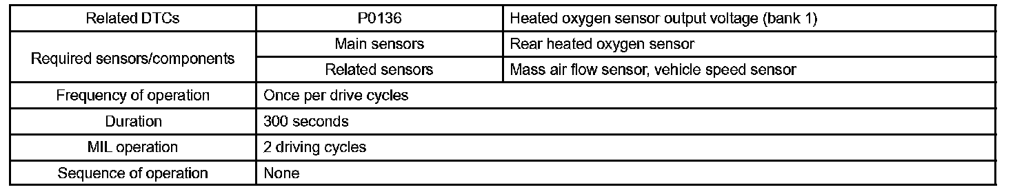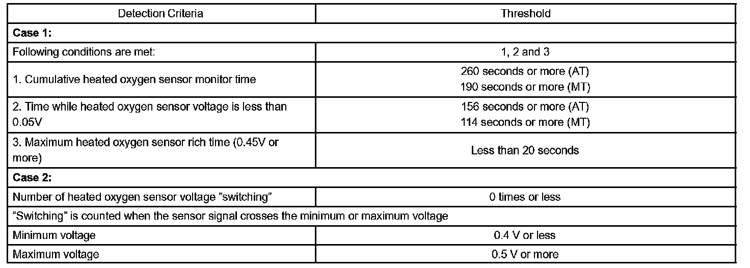 If the rear heated oxygen sensor output dose not change between RICH and LEAN during "Stop and GO" driving, the ECM interprets this as a malfunction in the rear heated oxygen sensor and sets a DTC. Also, if the sensor output remains at less than 0.05 V for more than 156 seconds when ECM monitored the heated oxygen sensor for 260 seconds while the air fuel feedback is being performed (the detecting condition differs depending on the type of vehicles), the ECM will interpret this as a fault. In either case, the ECM will turn on the MIL and set a DTC.