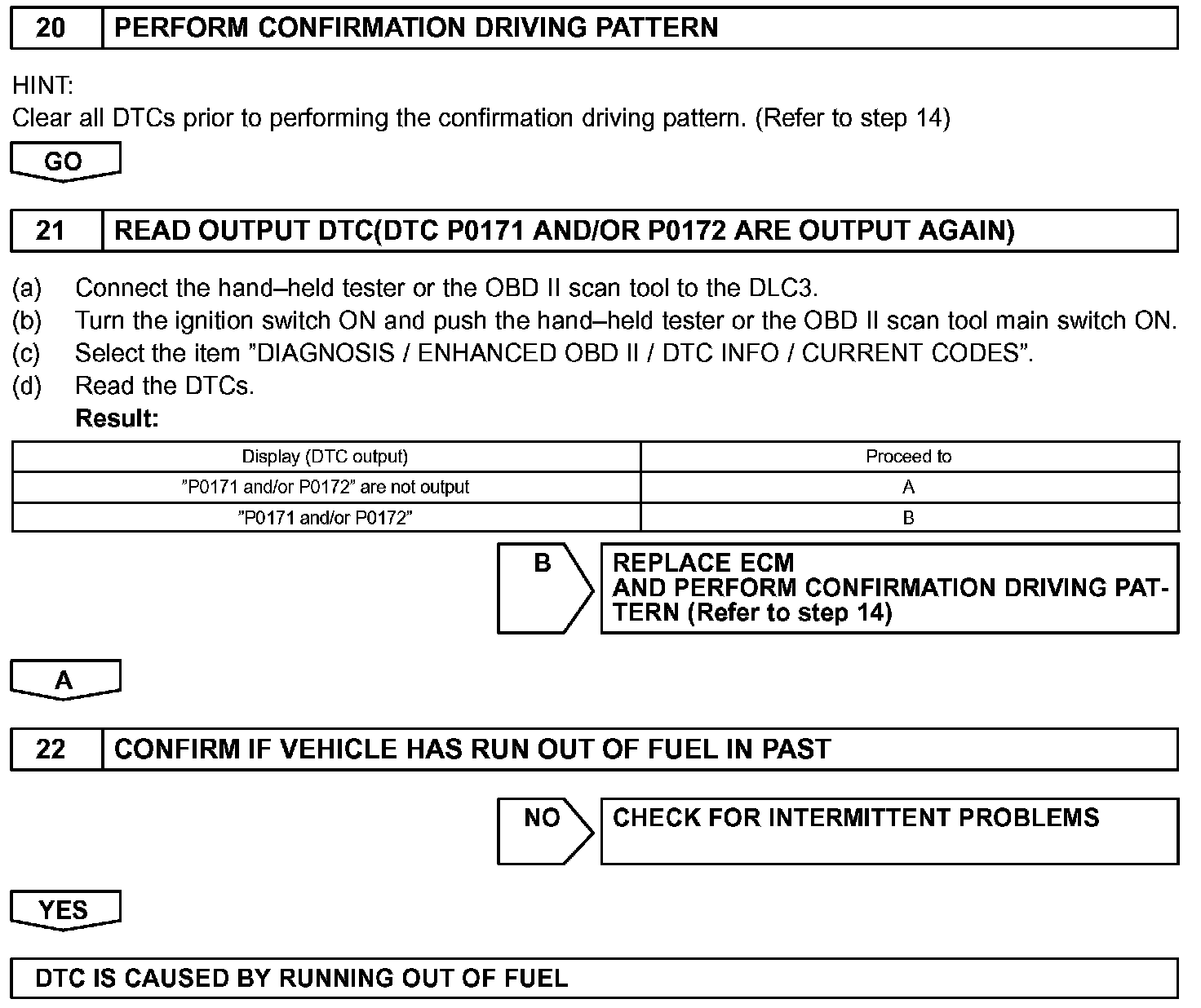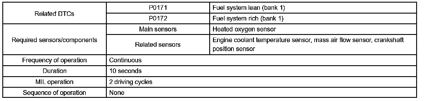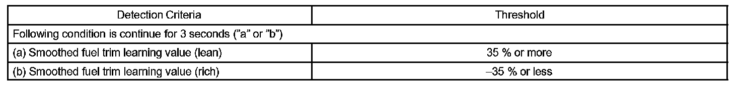 Under the closed-loop fuel control, fuel injection amounts that deviate from the ECMAs estimated fuel amount will cause a change in the long-term fuel trim compensation value. This long-term fuel trim is adjusted when there are persistent deviations in the short-term fuel trim values. And the deviation from a simulated fuel injection amount by the ECM affects a smoothed fuel trim learning value which is the combination of smoothed short-term fuel trim (fuel feedback compensation value) and smoothed long-term fuel trim (learning value of the air-fuel ratio). When the smoothed fuel trim learning value exceeds the DTC threshold, the ECM interprets this as a fault in the fuel system and sets a DTC.