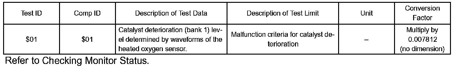 The vehicle is equipped with the two oxygen sensors (O2S). One is mounted upstream from the three-way catalytic (TWC) converter (front heated oxygen sensor "sensor 1" ), the second is mounted downstream (heated oxygen sensor "sensor 2" ). The catalyst efficiency monitor compares the sensor 1 and 2 signals in order to calculate TWC ability to store oxygen.