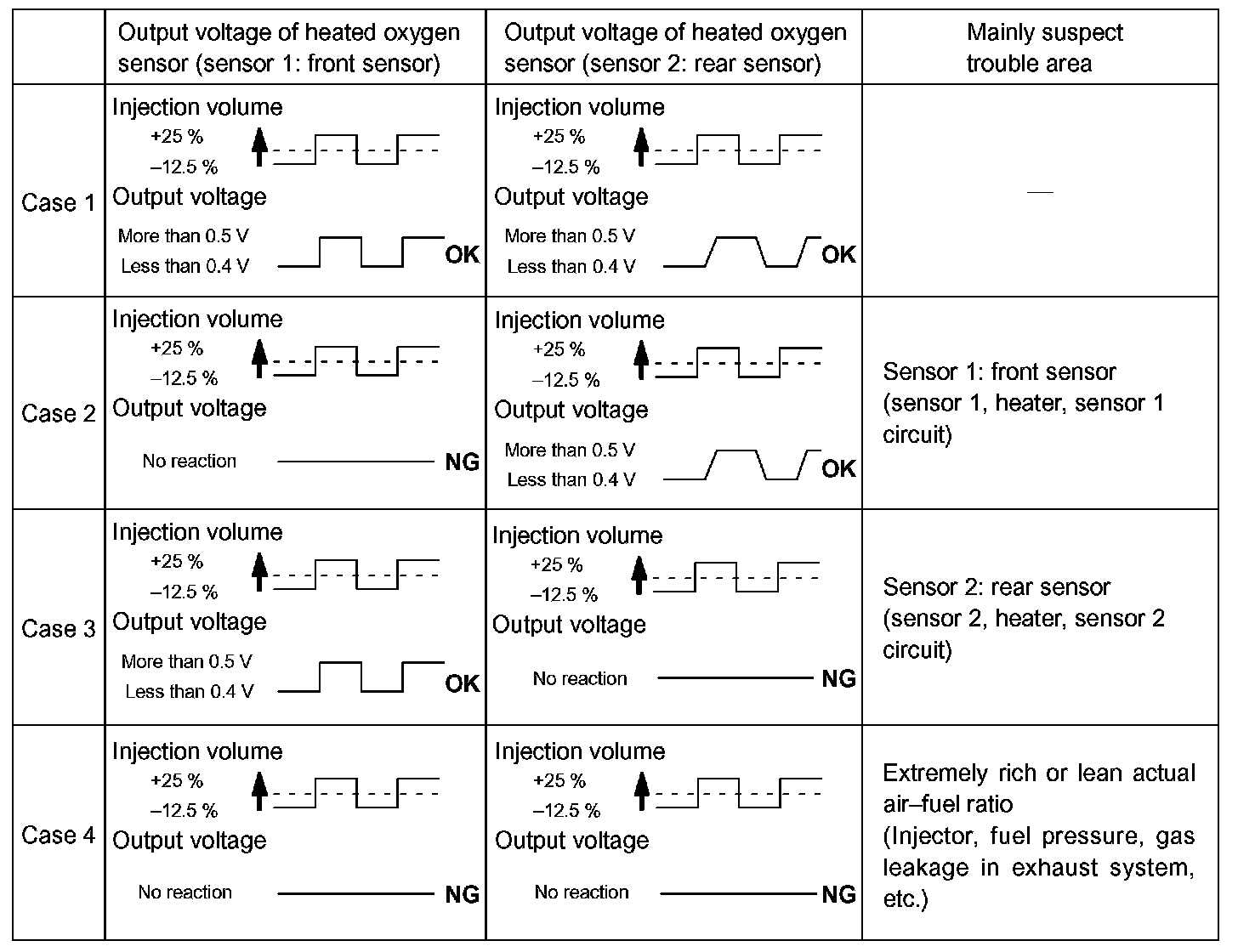- The following procedure enables the technician to identify a trouble area if malfunction in both front and rear heated oxygen sensors other than the catalyst converter, or the malfunction that indicates the actual air-fuel ratio extremely RICH or LEAN.