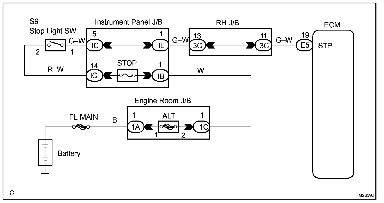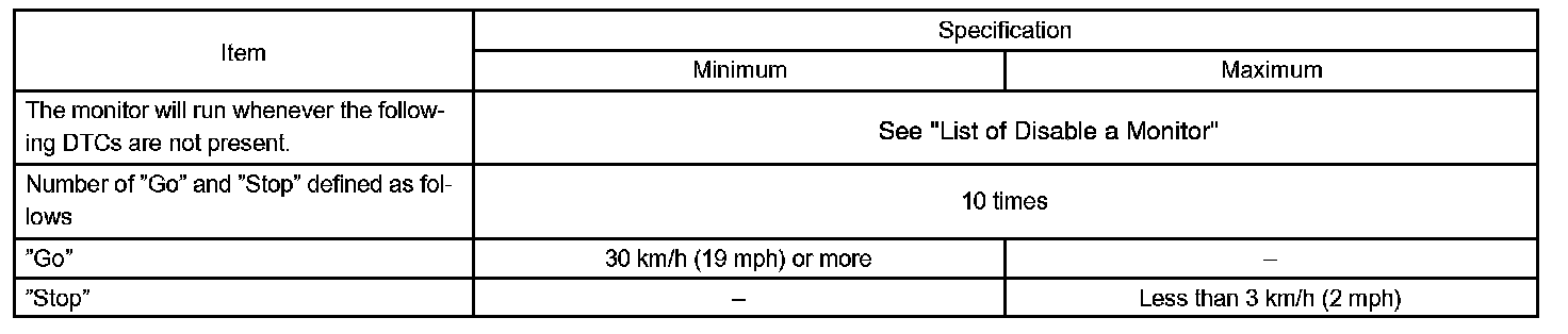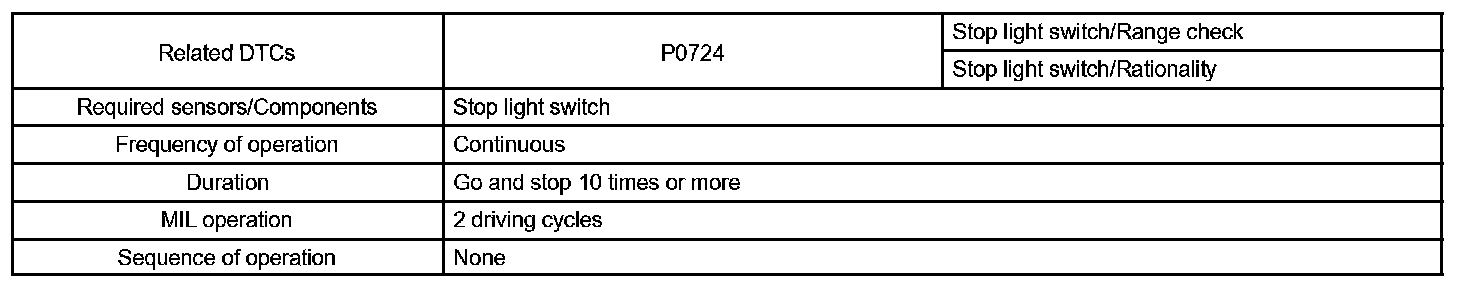 The circuit prevents the engine from stopping when the vehicle is stopped by sudden braking when the torque converter clutch is in the "lock-up" mode. The ECM receives the signal from the stop light switch at the time brake pedal is depressed. Then, the ECM sends the signal to the lock-up solenoid valve not to be in lock-up condition. When the stop light switch remains ON during "stop and go" driving, the ECM interprets this as a fault in the stop light switch and the MIL comes on. The vehicle must stop and go (3 km/h (2 mph) to 30 km/h (19 mph)) ten times for two driving cycles in order to detect malfunction.