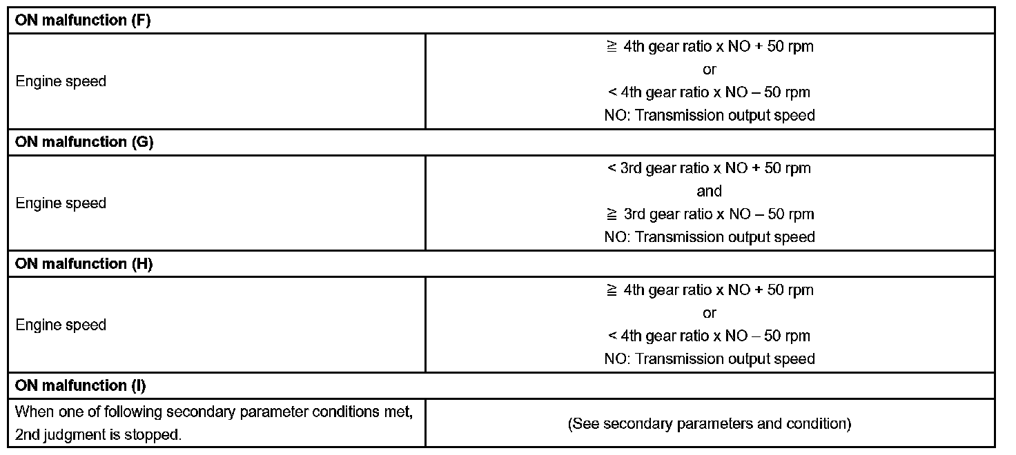 The ECM commands gear shifts by turning the shift solenoid valves "ON/OFF". According to the input shaft revolution, intermediate (counter) shaft revolution and output shaft revolution, the ECM detects the actual gear position (1st, 2nd, 3rd or O/D gear position). When the gear position commanded by the ECM and the actual gear position are not same, the ECM illuminates the MIL.