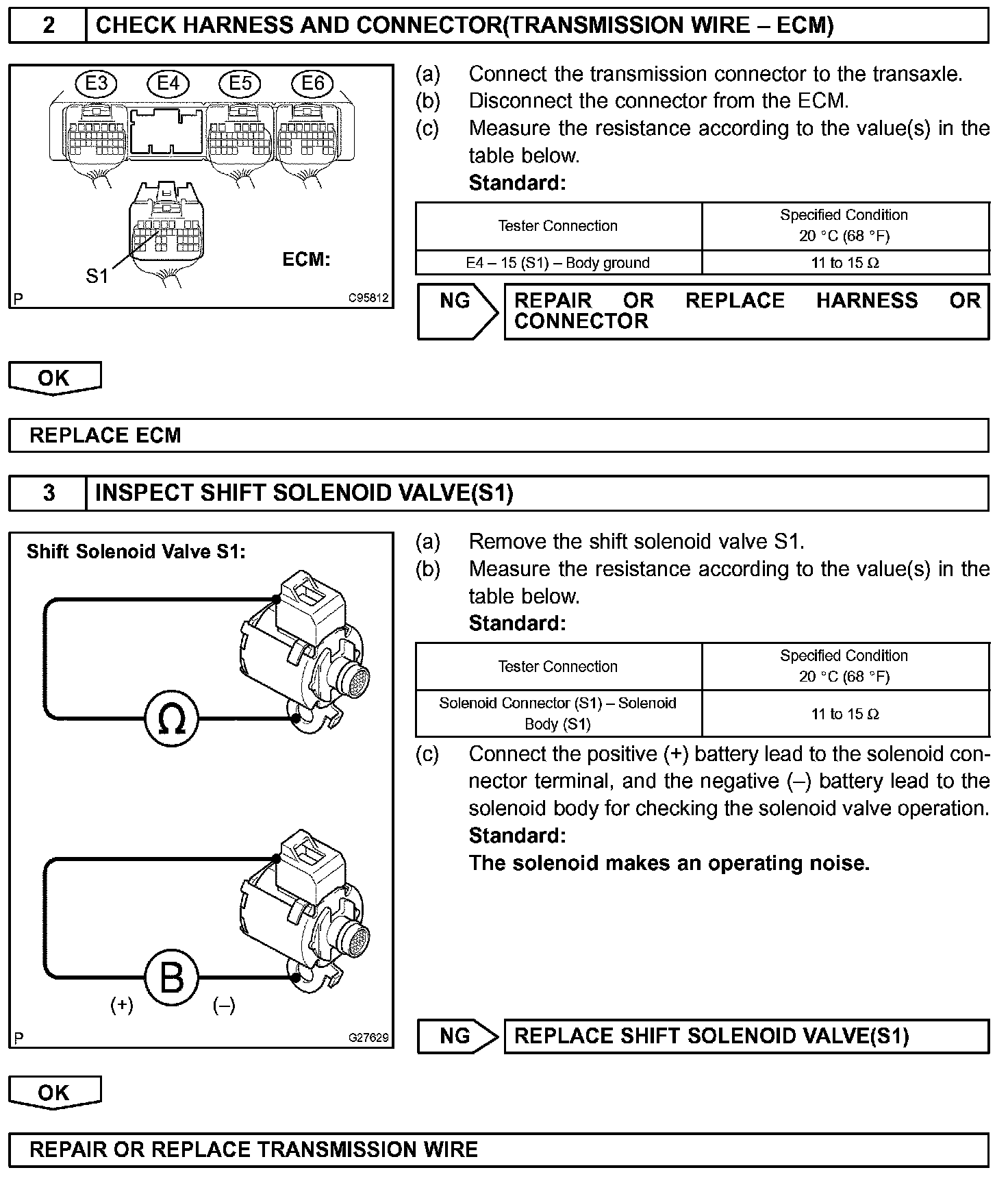 If either of the solenoid valve circuits develops an open or short, the ECM turns the other solenoid valve ON and OFF to shift to the gear positions shown in the table. If both solenoids malfunction, hydraulic control cannot be performed electronically and must be done manually.