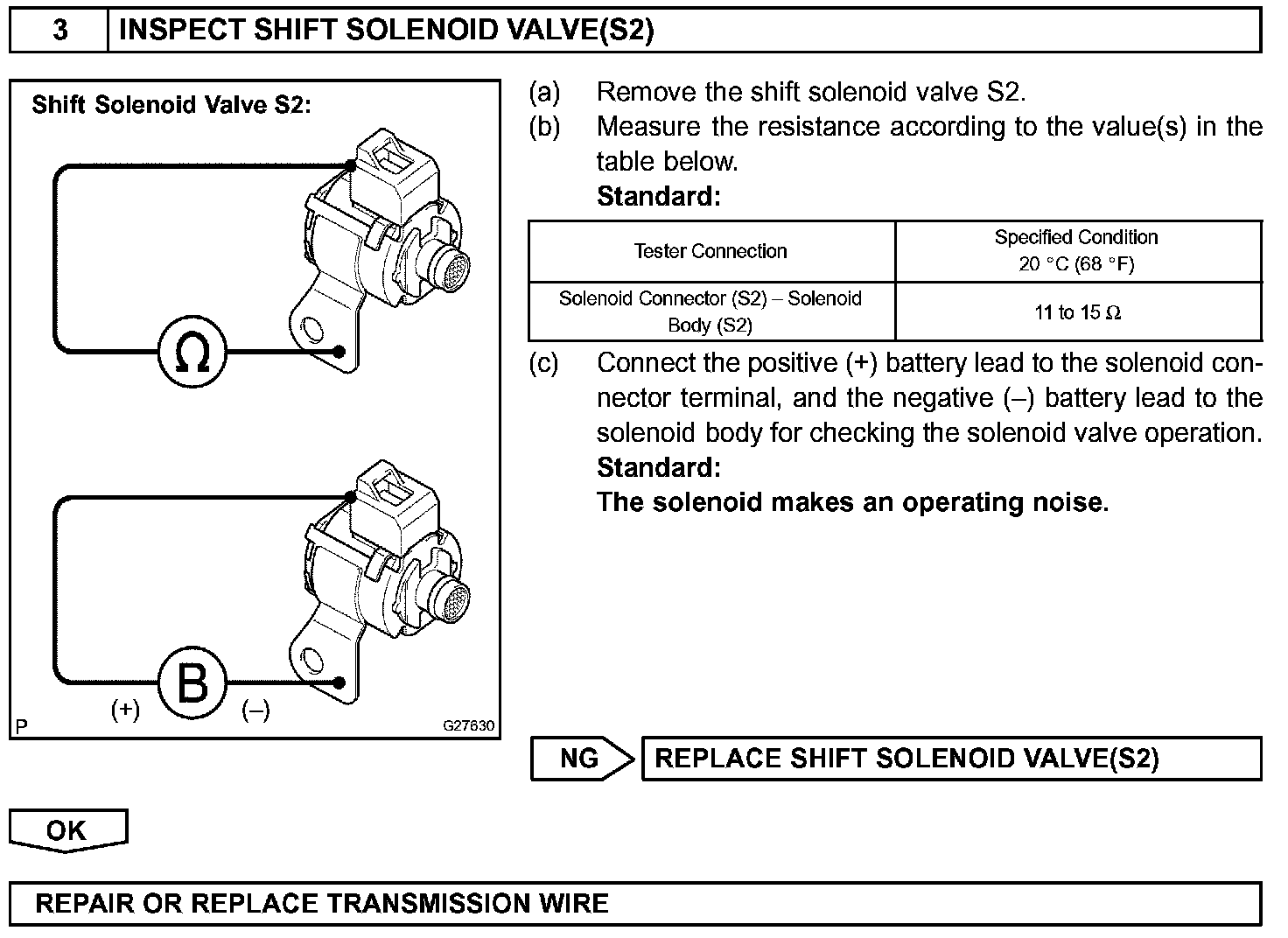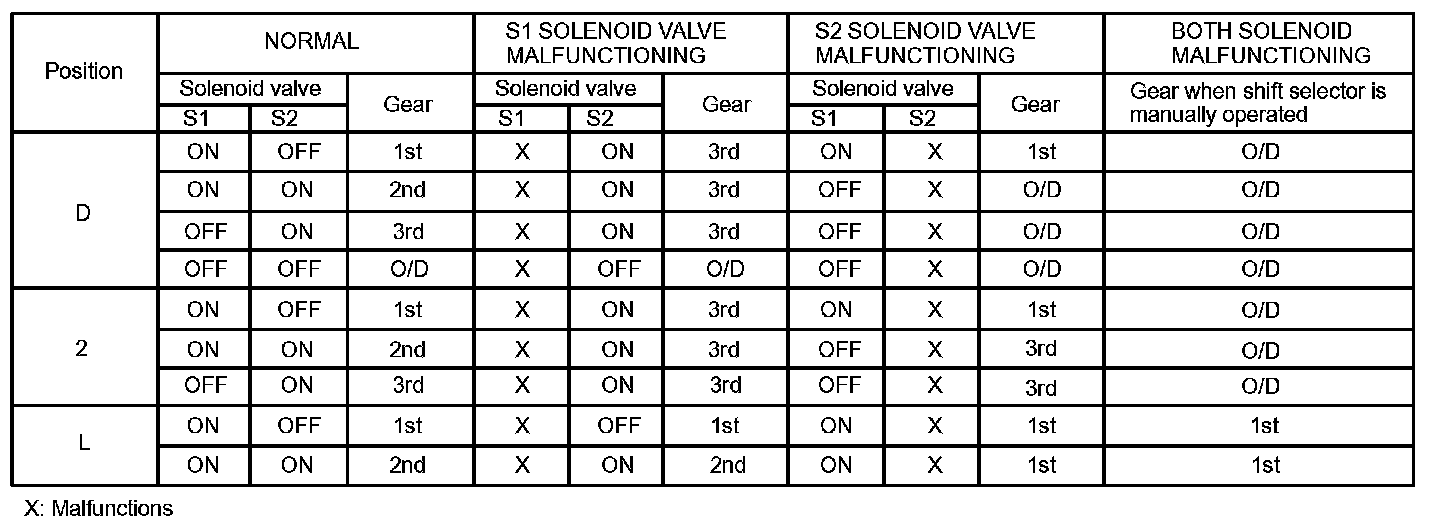 If either of the solenoid valve circuits develops an open or short, the ECM turns the other solenoid valve ON and OFF to shift to the gear positions shown in the table. If both solenoids malfunction, hydraulic control cannot be performed electronically and must be done manually.