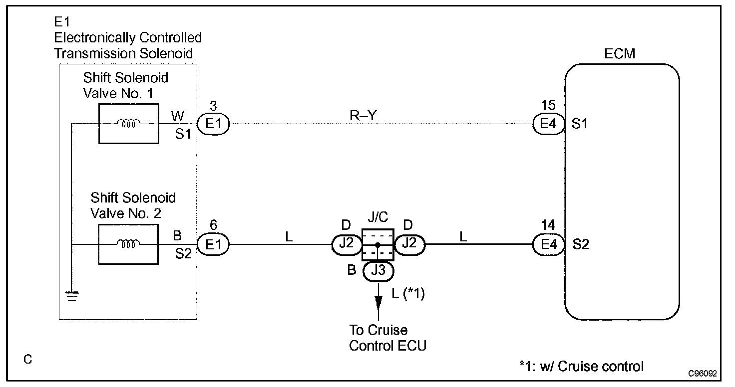 Shifting from 1st to O/D is performed in combination with ON and OFF of the shift solenoid valve S1 and S2 controlled by ECM. If an open or short circuit occurs in either of the solenoid valves, the ECM controls the remaining normal solenoid valve to allow the vehicle to be operated smoothly (Fail safe function).