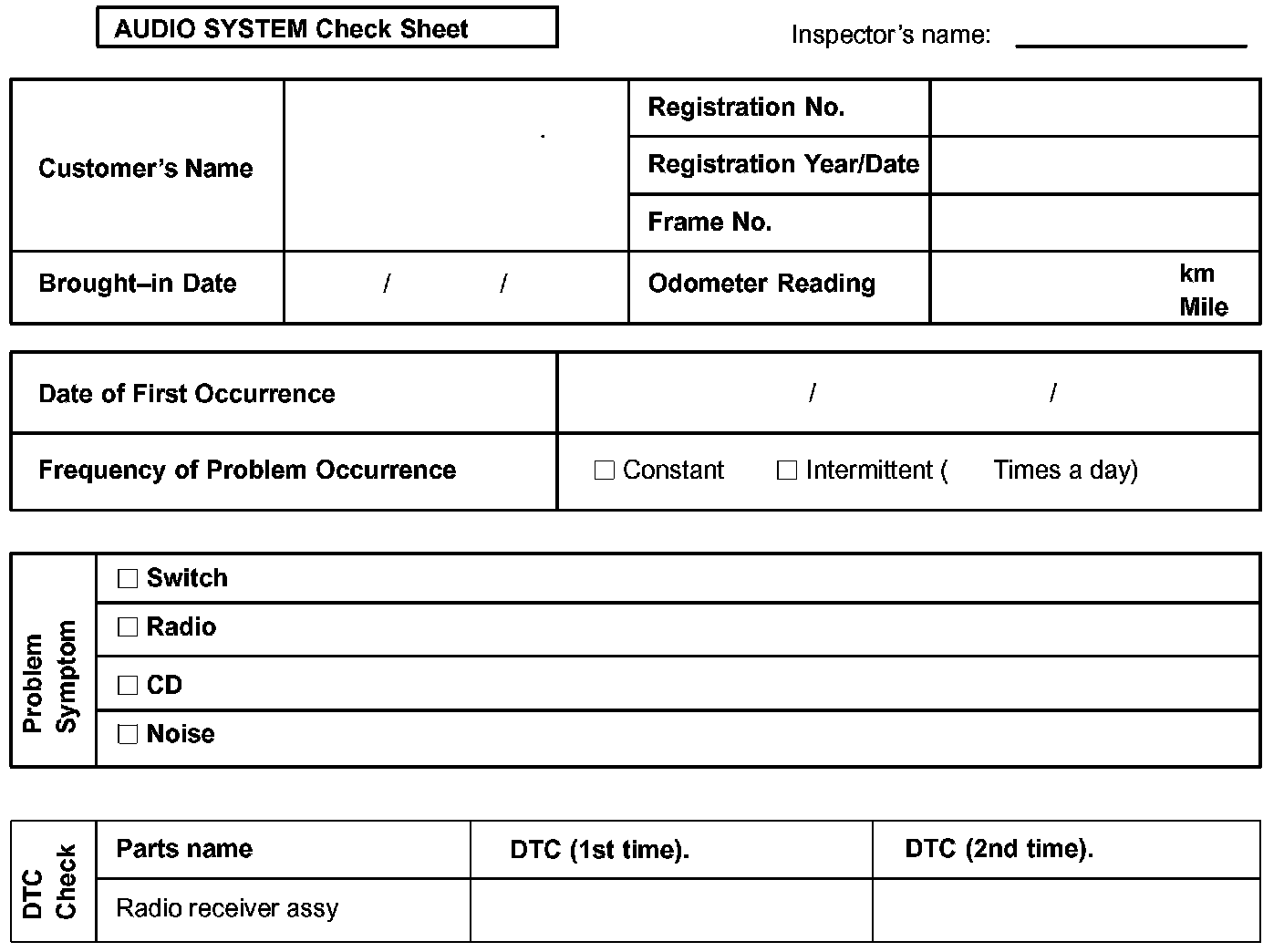 Audio System Check Sheet:
