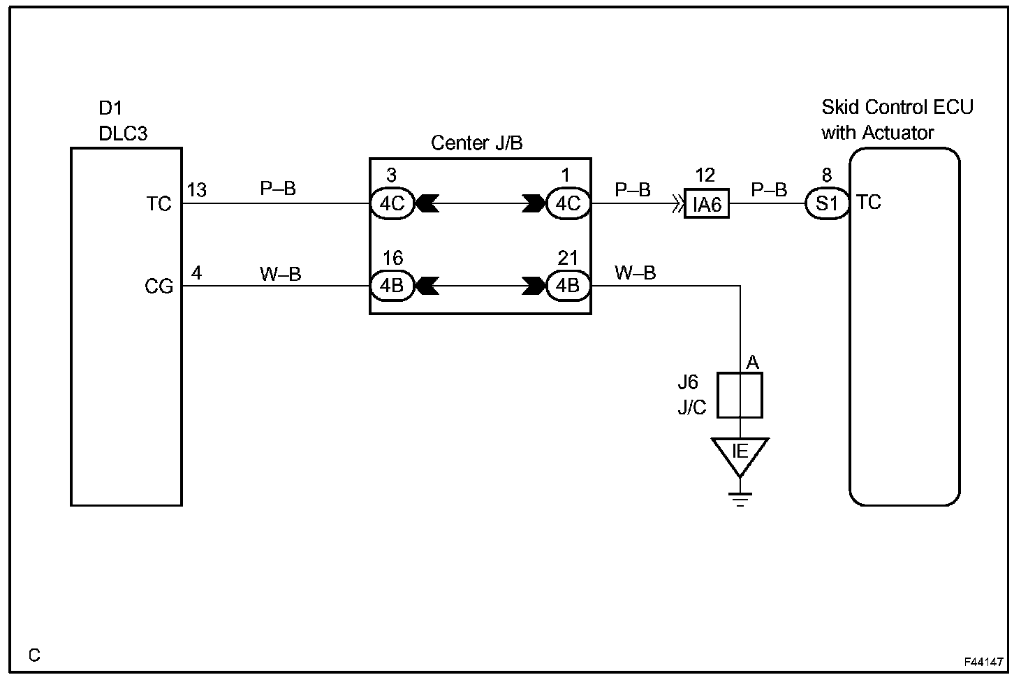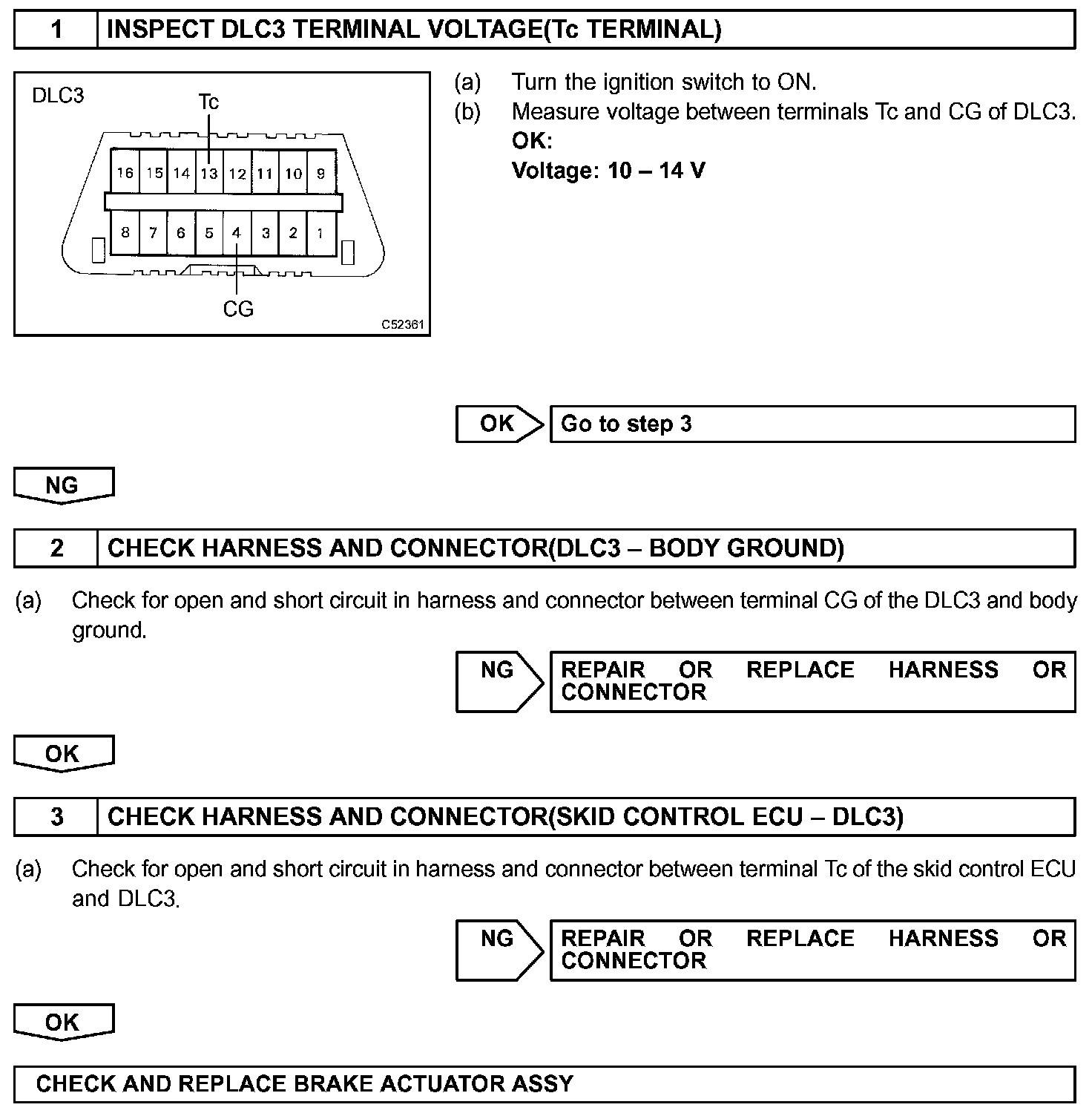 Connecting terminals Tc and CG of the DLC3 causes the ECU to display the DTC by flashing the ABS warning light.