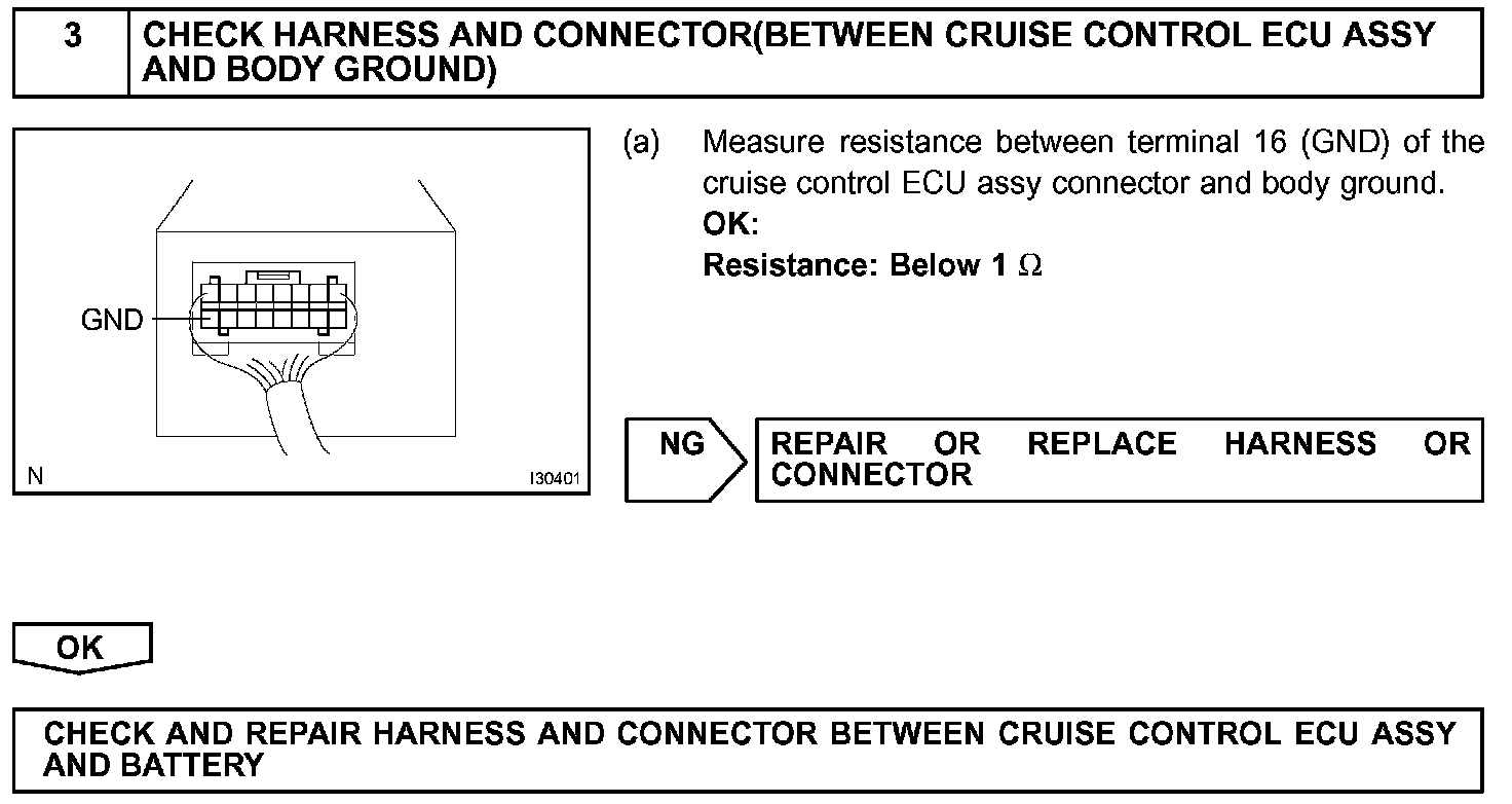 The cruise control ECU assy power source supplies power to the actuator and sensors, etc., when terminal GND and the case of the cruise control ECU assy are grounded.