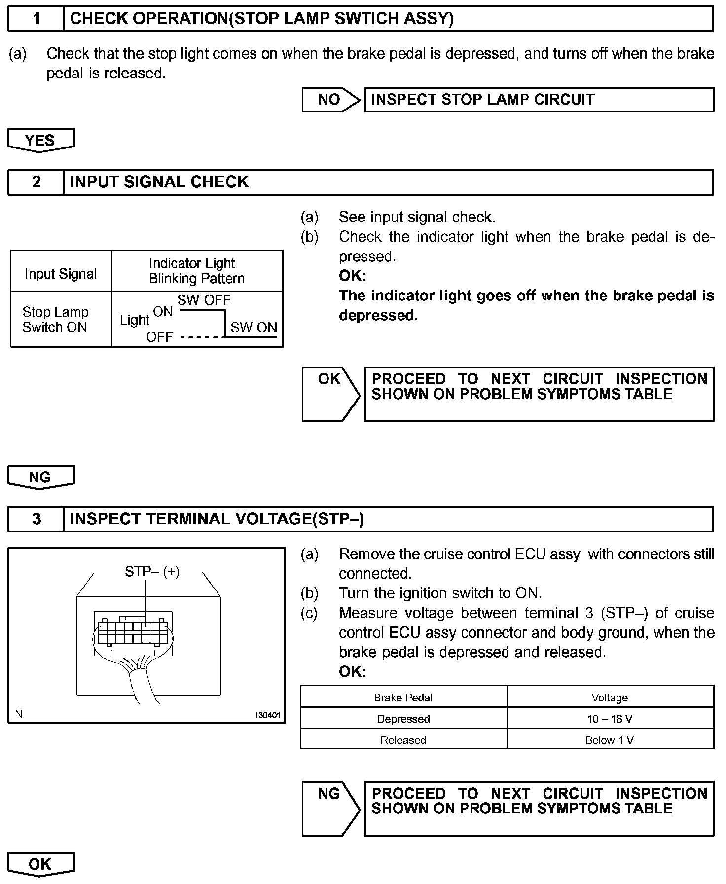 If the harness connected to terminal STP- has an open circuit, terminal STP- will have battery positive voltage and the cruise control will be turned off.