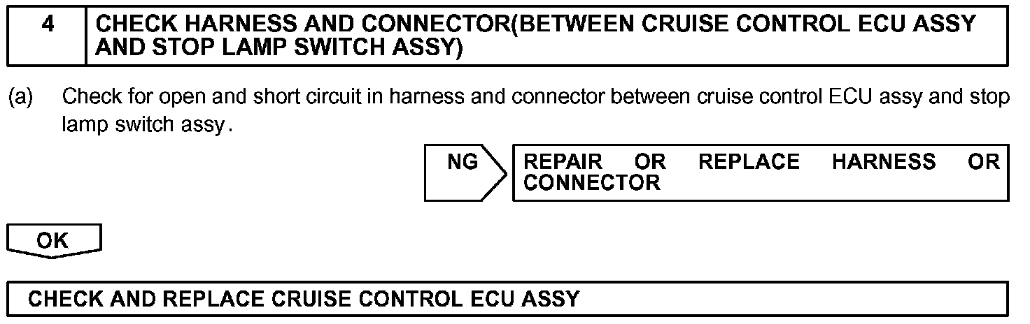When the brake pedal is depressed, normal battery positive voltage normally is applied through the STOP fuse and stop lamp switch assy to terminal STP- of the cruise control ECU assy, and the cruise control ECU assy turns the cruise control to off.