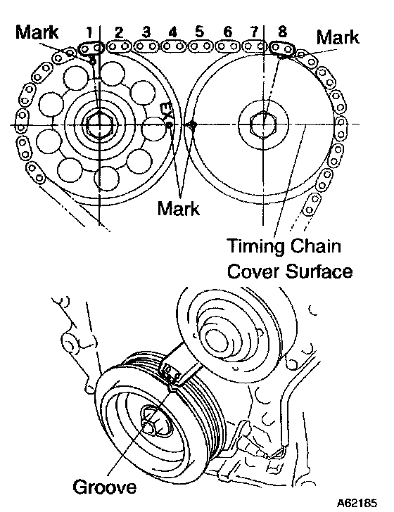 a. Turn the crankshaft pulley, and align its groove with timing mark "0" of the timing chain cover.