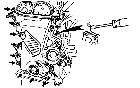 c. Install the timing chain cover with the 11 bolts and nut.
