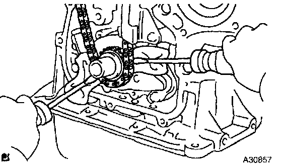 a. Remove the timing chain with the crankshaft timing gear plying screwdrivers as shown in the illustration.