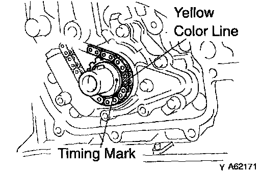 b. Install the timing chain on the crankshaft timing sprocket with the yellow color link aligned with the timing mark on the crankshaft timing sprocket.