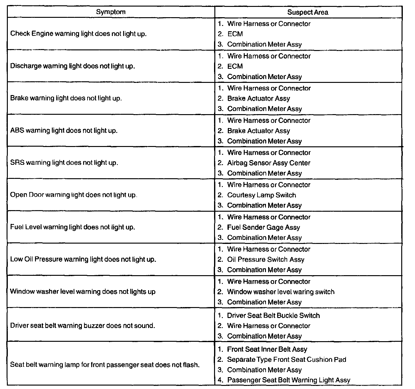 Problem Symptoms Table - Warning Lights (Combination Meter):