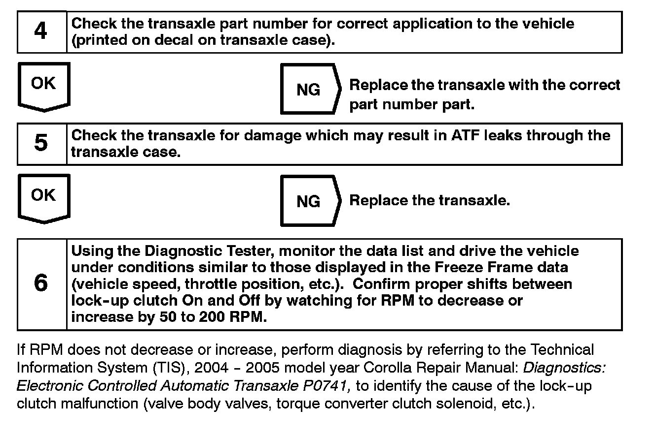 Some 2004 - 2005 model year Corolla vehicles may exhibit M.I.L. "ON" with DTC P0741 (Torque Converter Clutch Solenoid Performance). Production changes have occurred to correct this condition. Follow the repair procedure to address those vehicles that exhibit the condition.