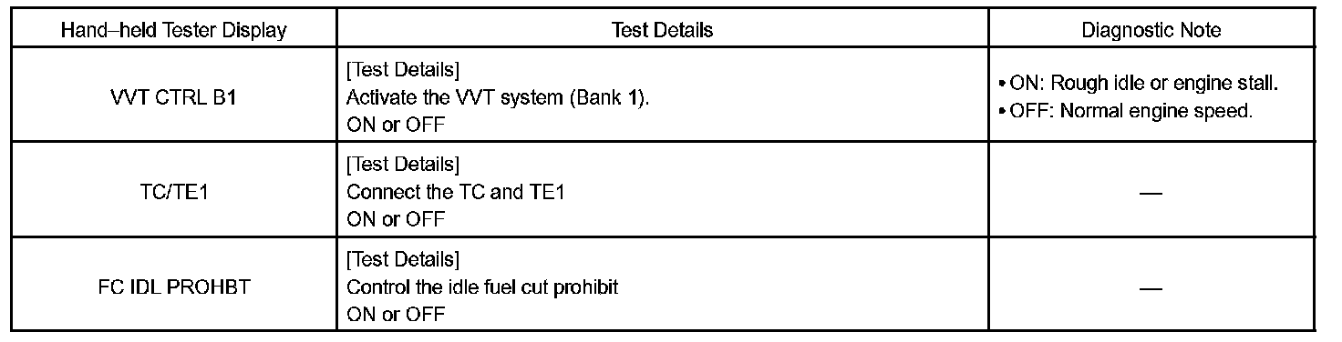 ACTIVE TESTHINT: Performing the ACTIVE TEST using the hand-held tester or the OBD II scan tool allows the relay, VSV, actuator and so on to operate without parts removal. Performing the ACTIVE TEST as a first step of troubleshooting is one method to shorten diagnostic time.
