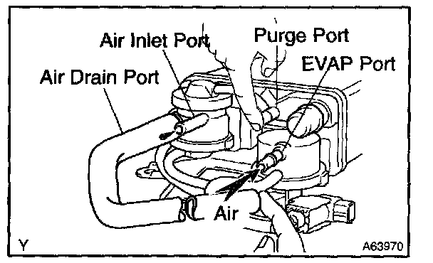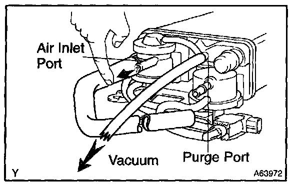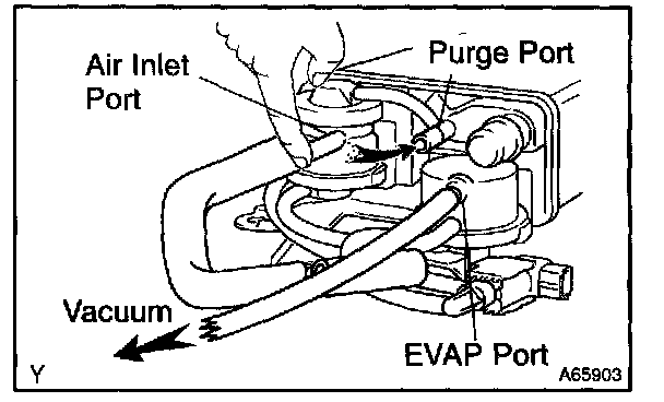 5. While holding the air inlet port closed, apply vacuum (3.43 kPa, 25.7 mmHg, 1.01 in.Hg) to the EVAP port and check that air flows into the purge port.