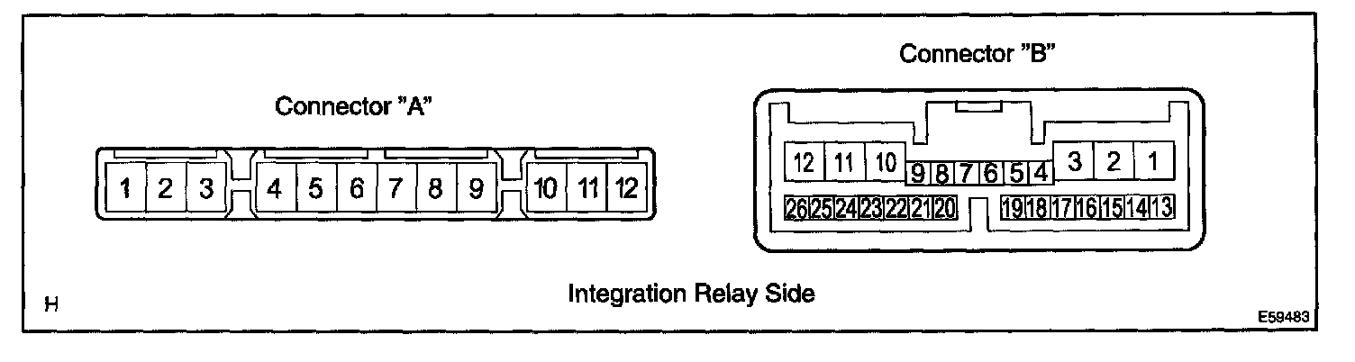 2. Connect the negative (-) lead from the battery to terminal A-5 and A-6, then check that the battery voltage (10 - 14 V) generates between terminal A-12 and A-9.