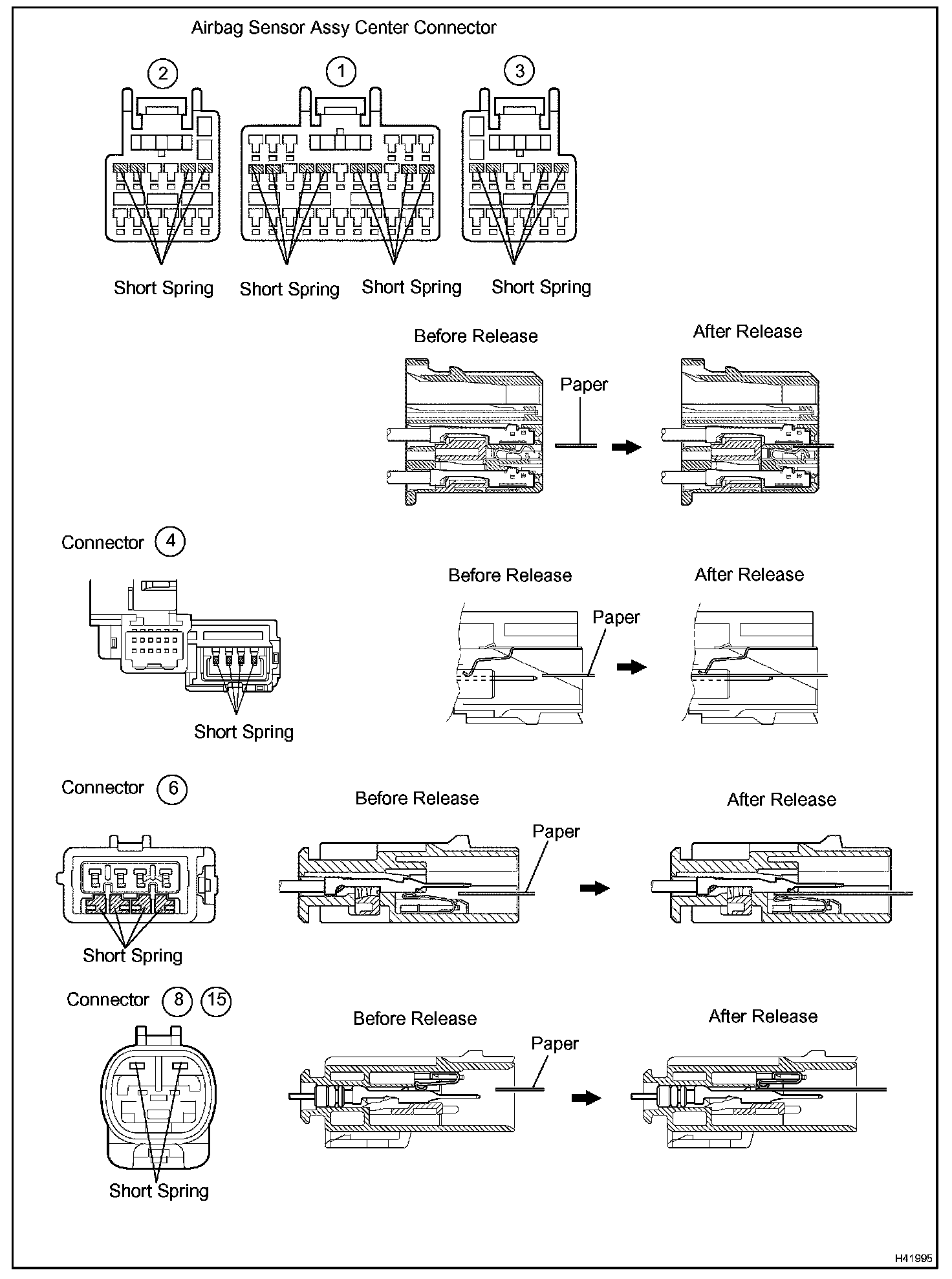 RELEASE METHOD OF AIRBAG ACTIVATION PREVENTION MECHANISMAn airbag activation prevention mechanism is built into the connector for the squib circuit of the SRS. When release of the airbag activation prevention mechanism is directed in the troubleshooting procedure, as shown in the illustration of the connectors, insert paper which has the same thickness as the male terminal between the terminal and the short spring.